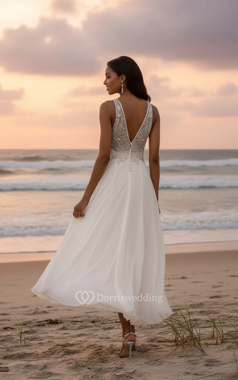 This is the perfect dress for a more relaxed wedding theme. The beading adds a touch of glamour and the tea length is very trendy. The chiffon skirt flows beautifully when you walk. I felt so comfortable and stylish. The quality is excellent and it fits true to size. I’m so happy I chose this for our beach celebration—it was exactly what I wanted.