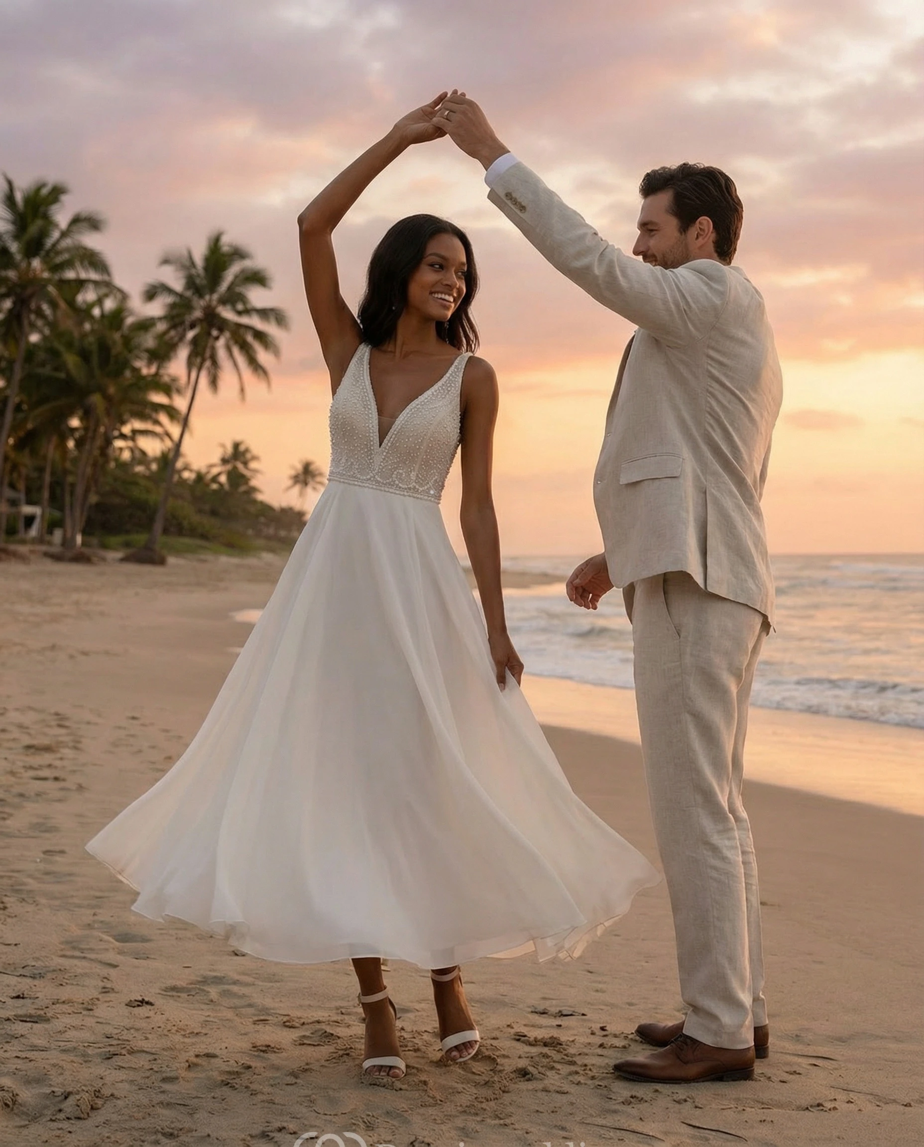 Finding a tea-length dress that still felt "bridal" was hard, but this one is perfect. The V-neck is flattering and the A-line skirt is so flowy. The beading on the bodice is intricate and didn't fall off during travel. It’s the ideal choice for a beach wedding where you want to look like a bride but stay cool and mobile.