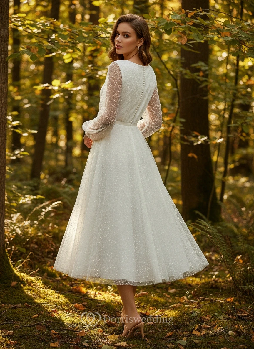 Tea-length Sparkly Long Sleeve Country Vintage Wedding Dress