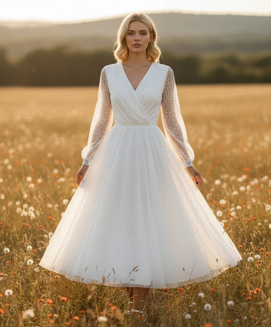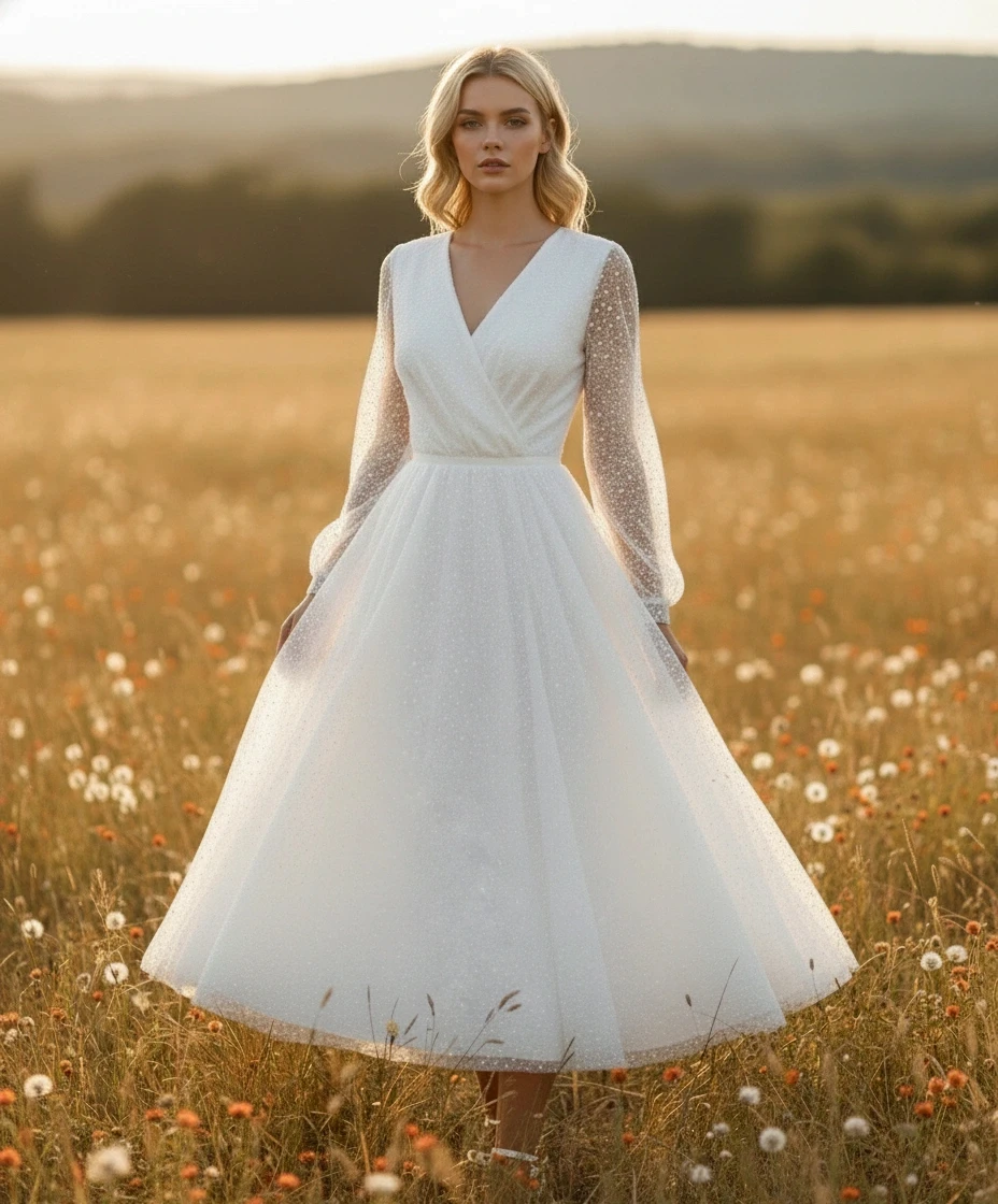 This elegant guest dress features long sleeves with subtle sparkly details and a flowing design. Set in a field with wildflowers under soft light, it offers a casual yet chic look. Perfect for a garden party or outdoor event as a wedding guest, it combines comfort with a touch of glamour.