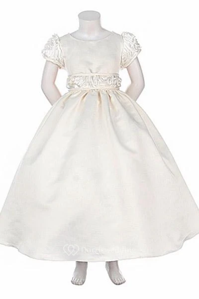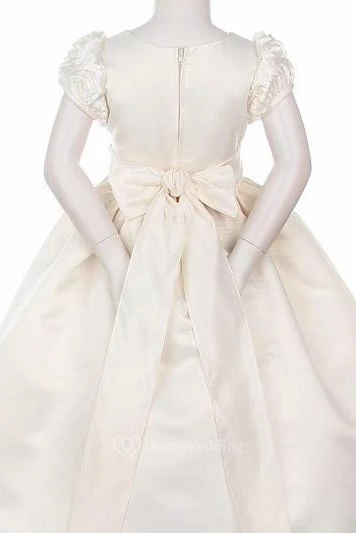 Tea-Length Split Cap-Sleeve Tiered Flower Girl Dress With Embroidery