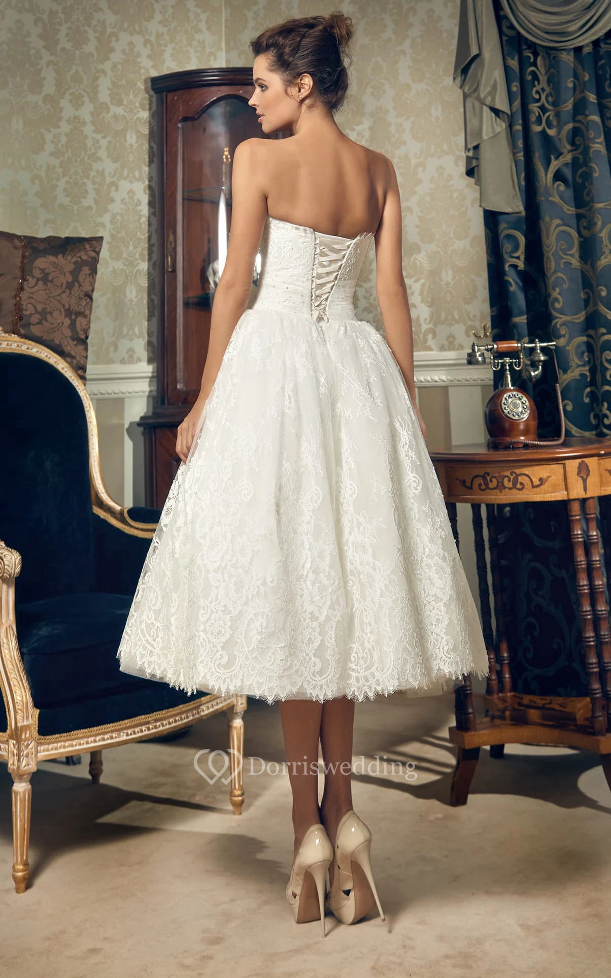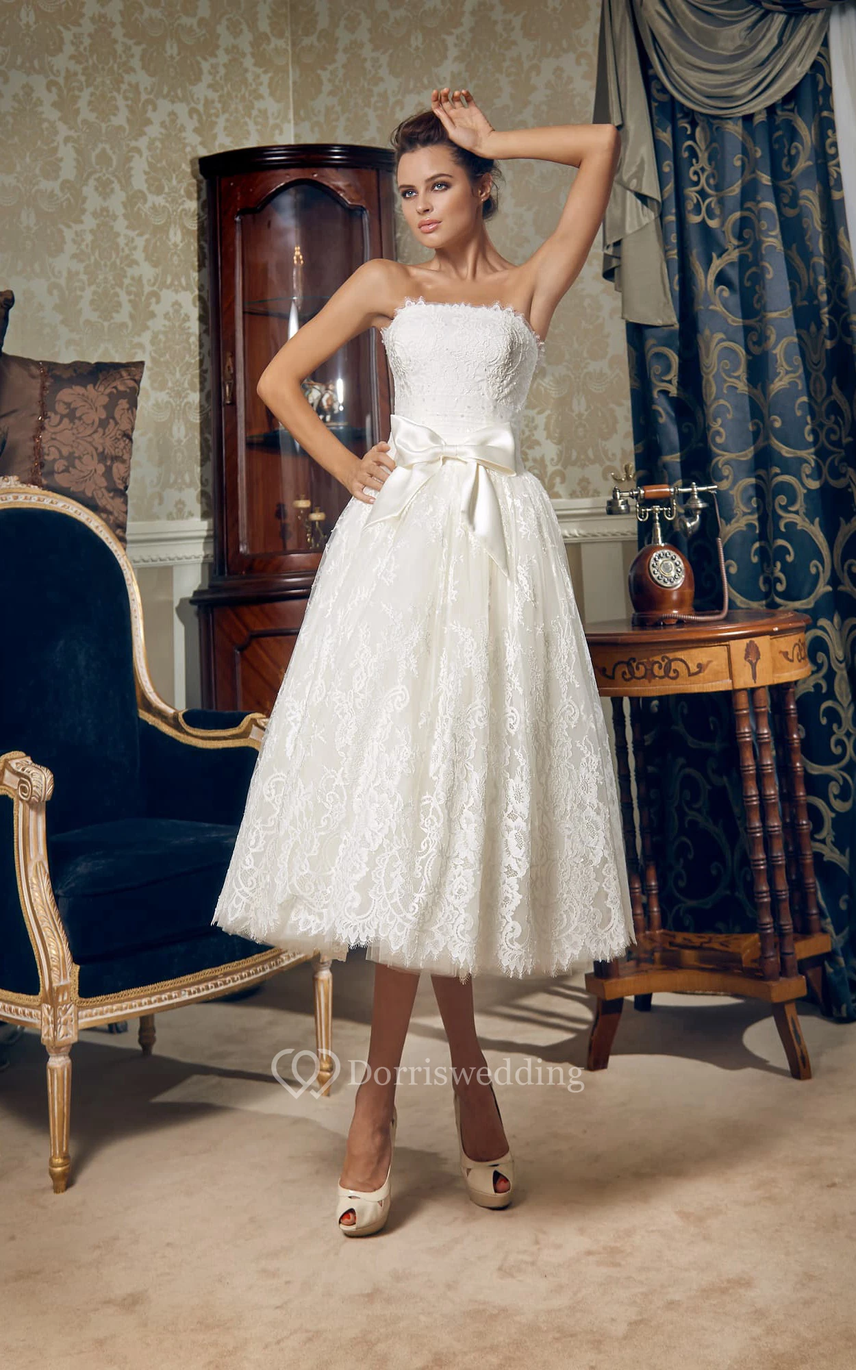 Tea-length Strapless Corset Back Lace Dress With Bow