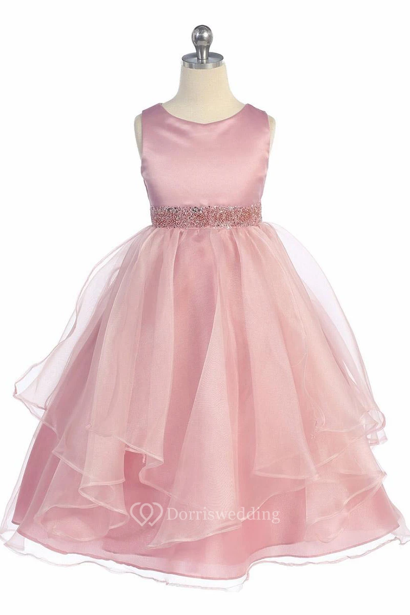 Tea-Length Tiered Beaded Sequins&Organza Flower Girl Dress With Sash