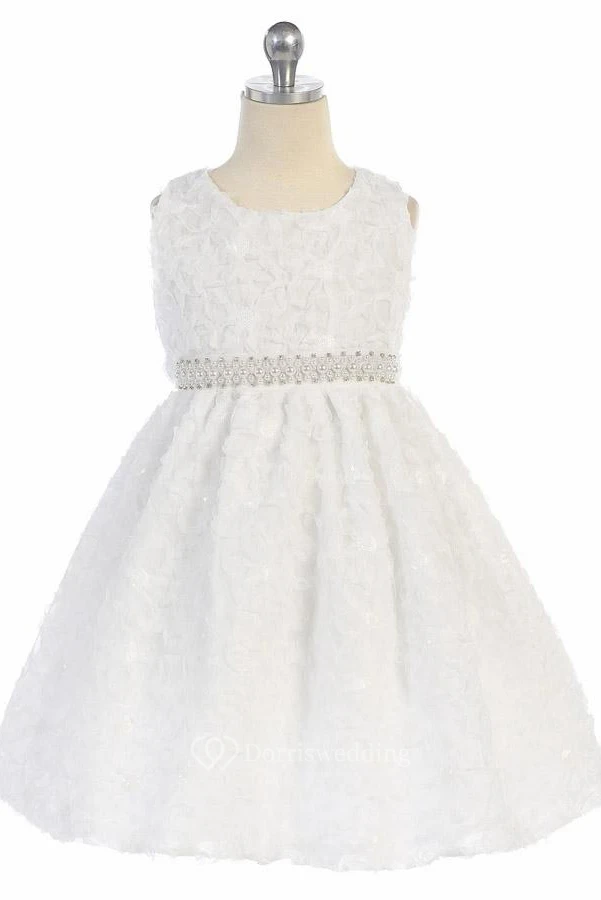 Tea-Length Tiered Beaded Sequins Flower Girl Dress
