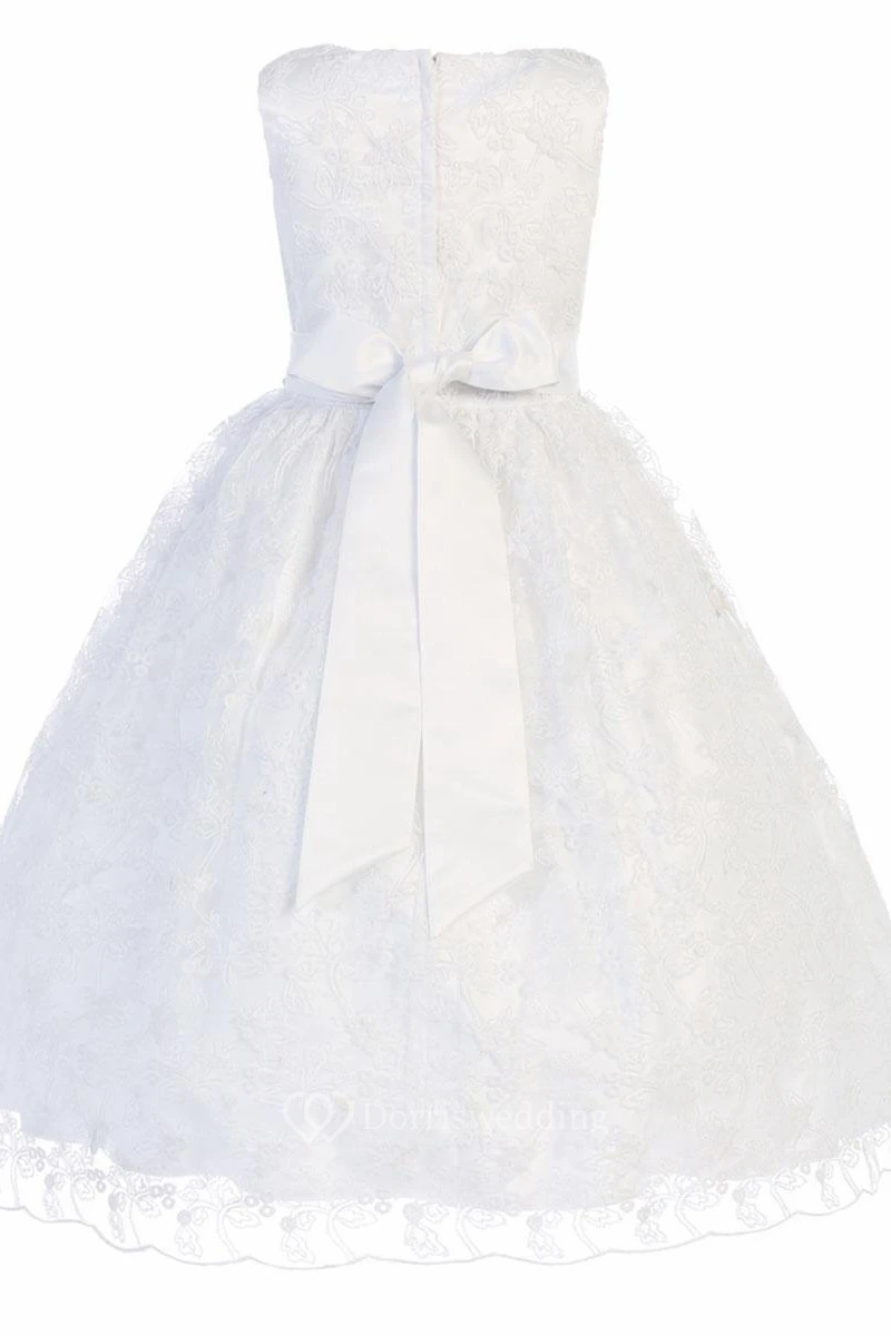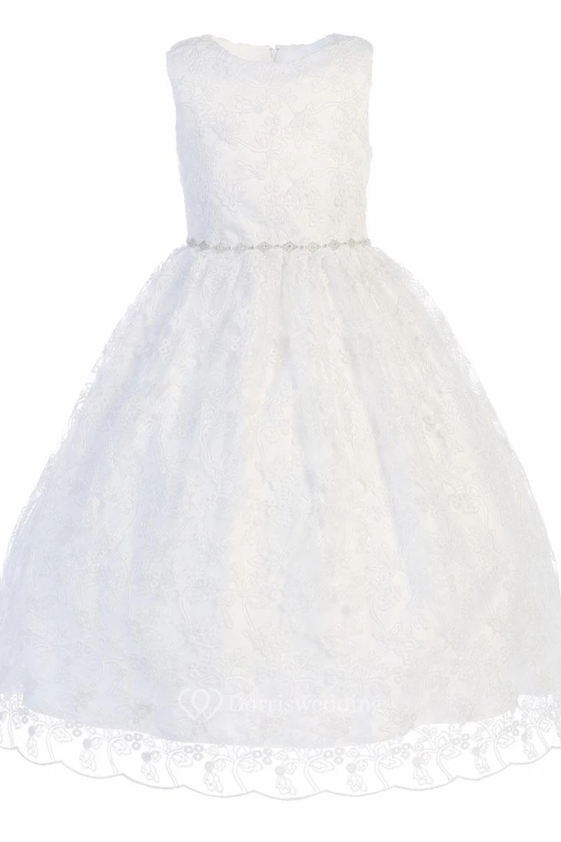 Tea-Length Tiered Beaded Tulle&Satin Flower Girl Dress