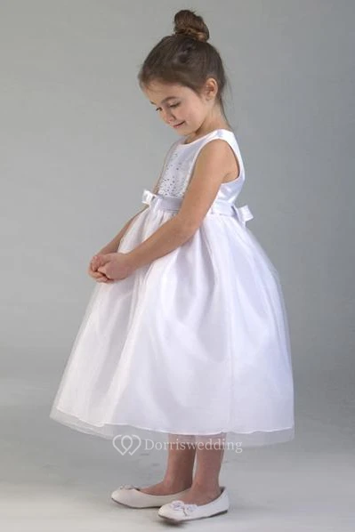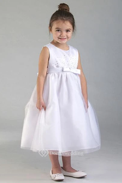 Tea-Length Tiered Bowed Tulle&Sequins Flower Girl Dress With Appliques