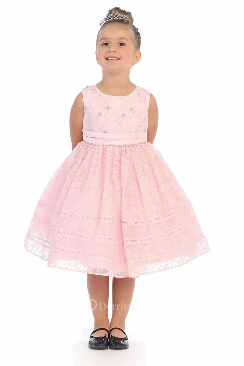 Tea-Length Tiered Pleated Lace Flower Girl Dress With Sash