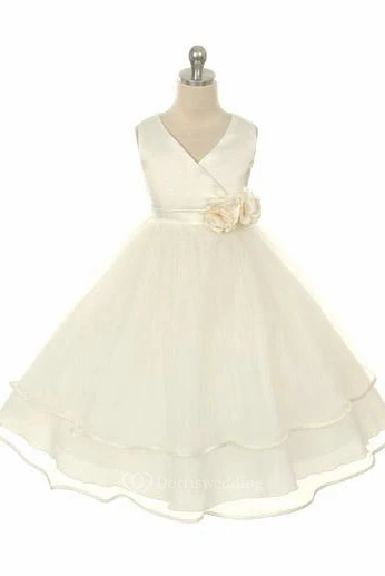 Tea-Length Tiered Tulle&Satin Flower Girl Dress
