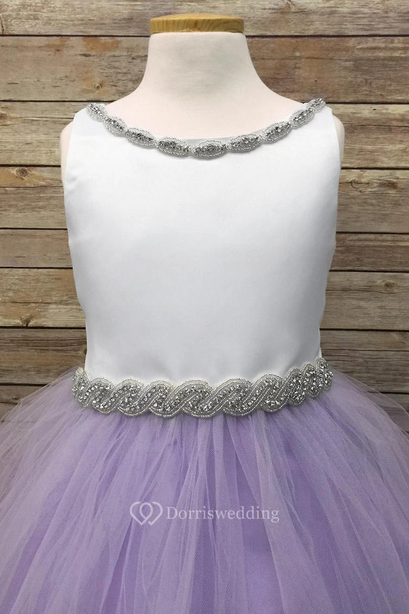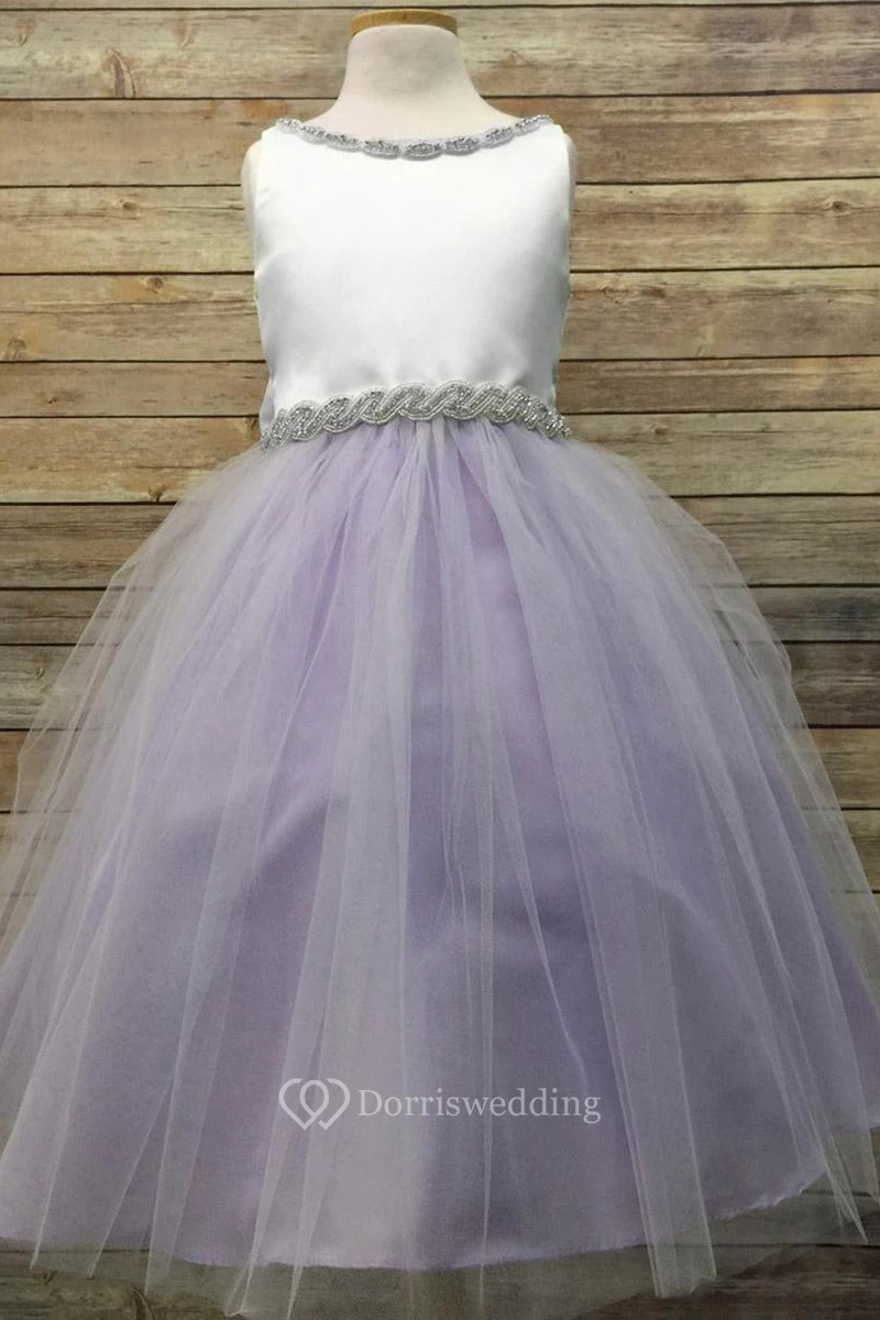 Tea-Length V-Neck Beaded Tulle&Satin Flower Girl Dress