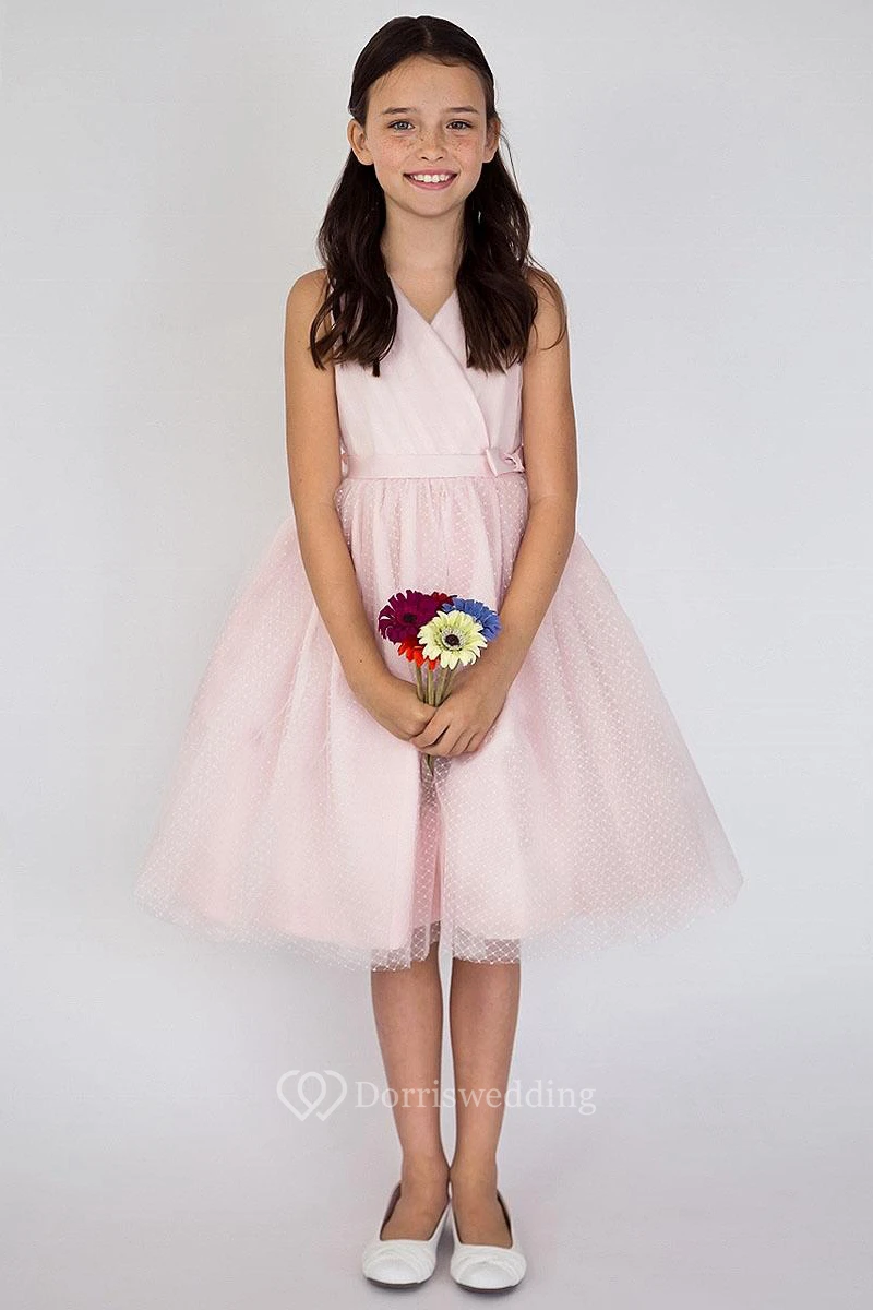 Tea-Length V-Neck Pleated Tiered Tulle&Satin Flower Girl Dress