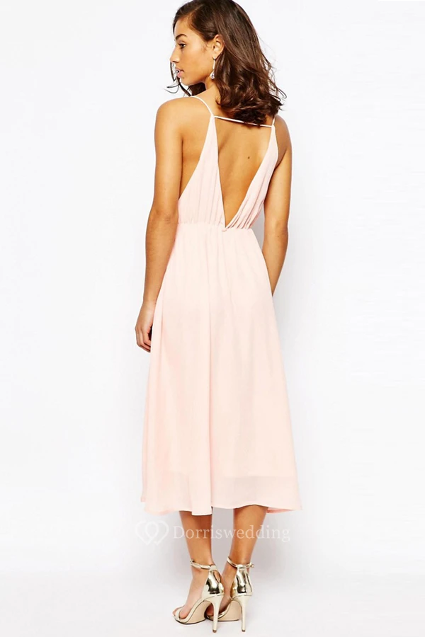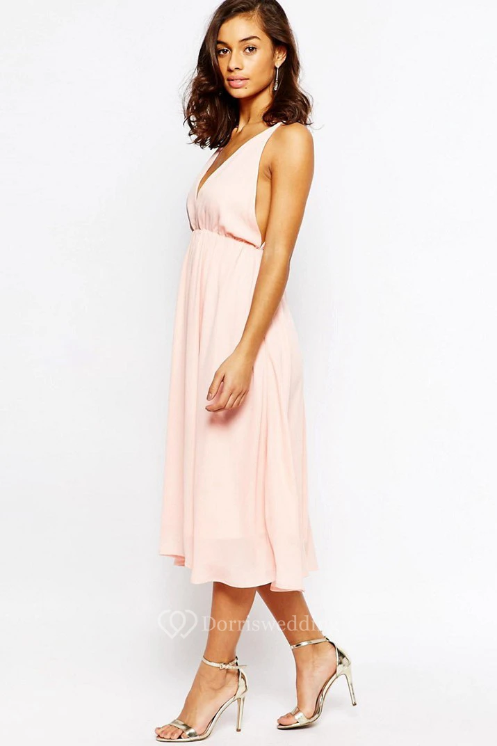 Tea-Length V-Neck Sleeveless Pleated Chiffon Bridesmaid Dress