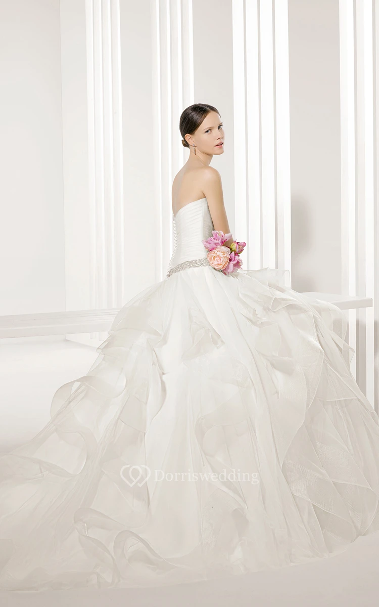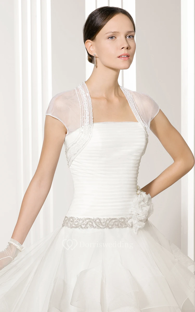 Top-Ruched Strapless Gown With Illusion Cape And Beaded Sash