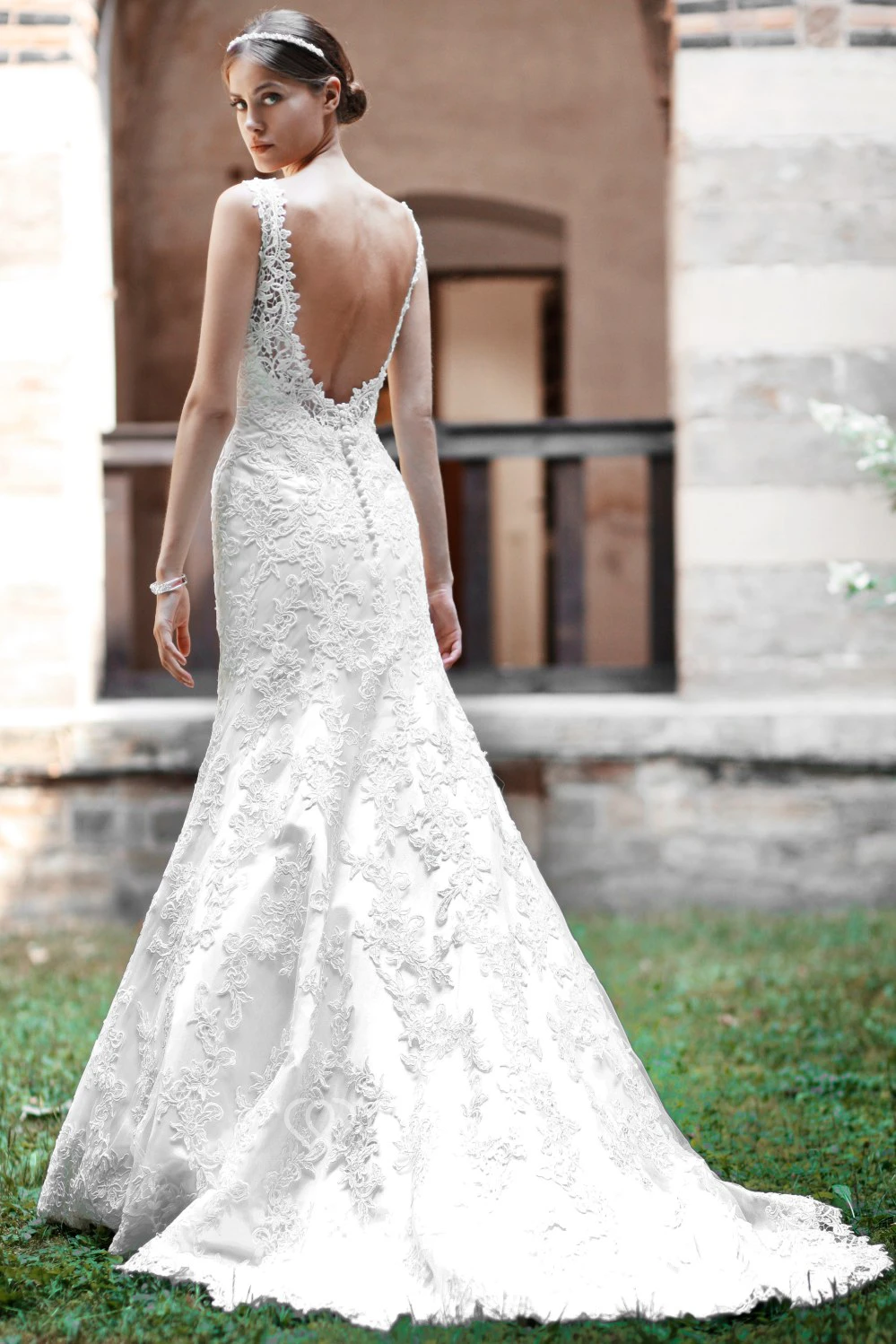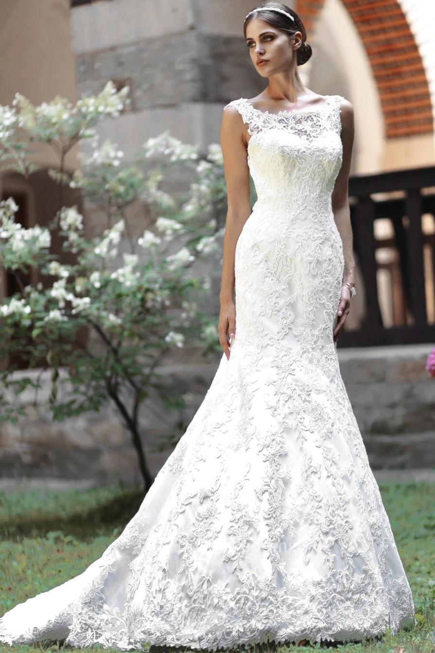 Trumpet Appliqued Floor-Length Scoop-Neck Lace Wedding Dress