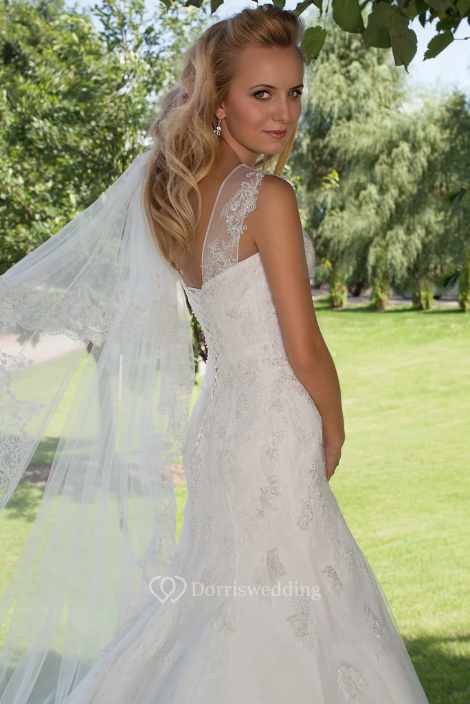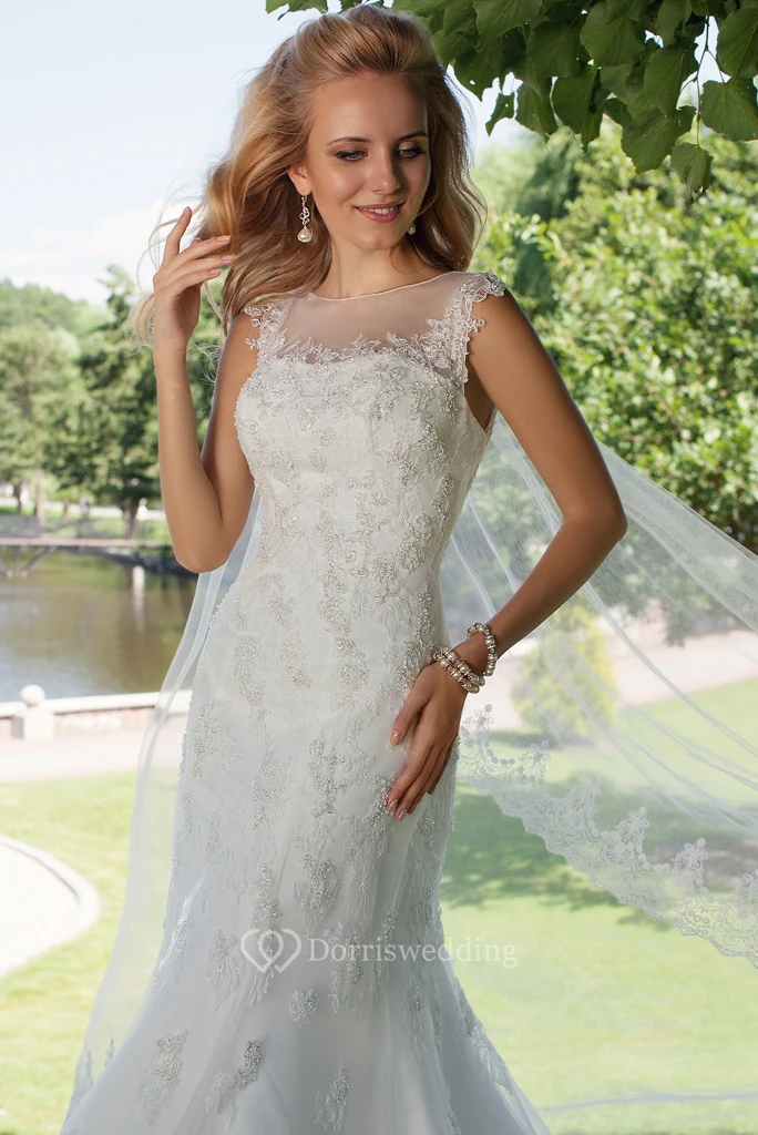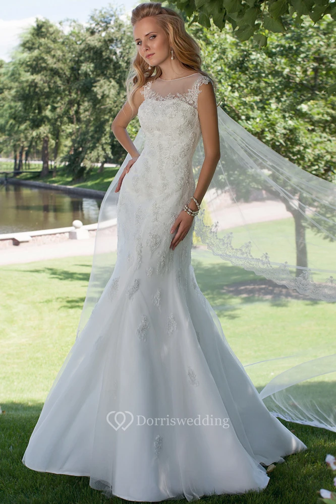Trumpet Appliqued Floor-Length Scoop Sleeveless Wedding Dress With Corset Back And Court Train