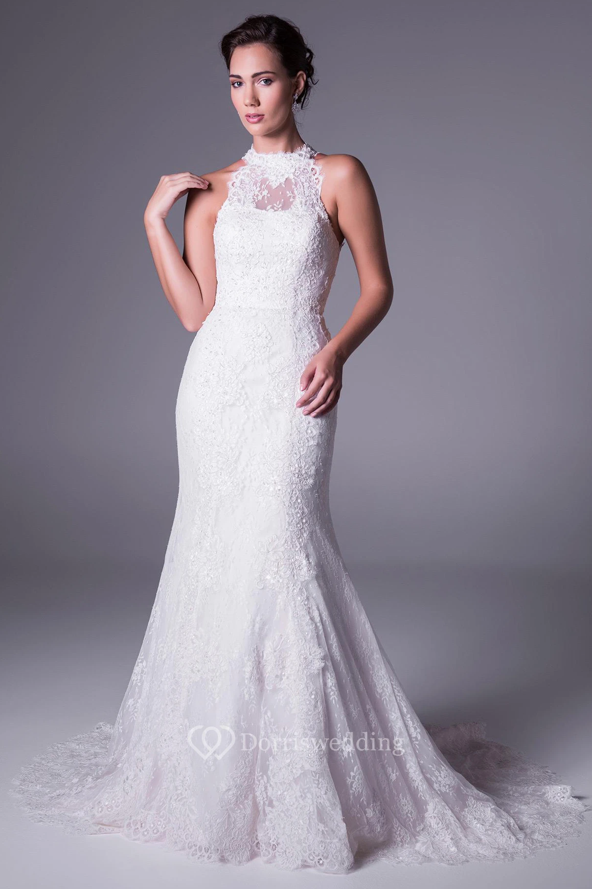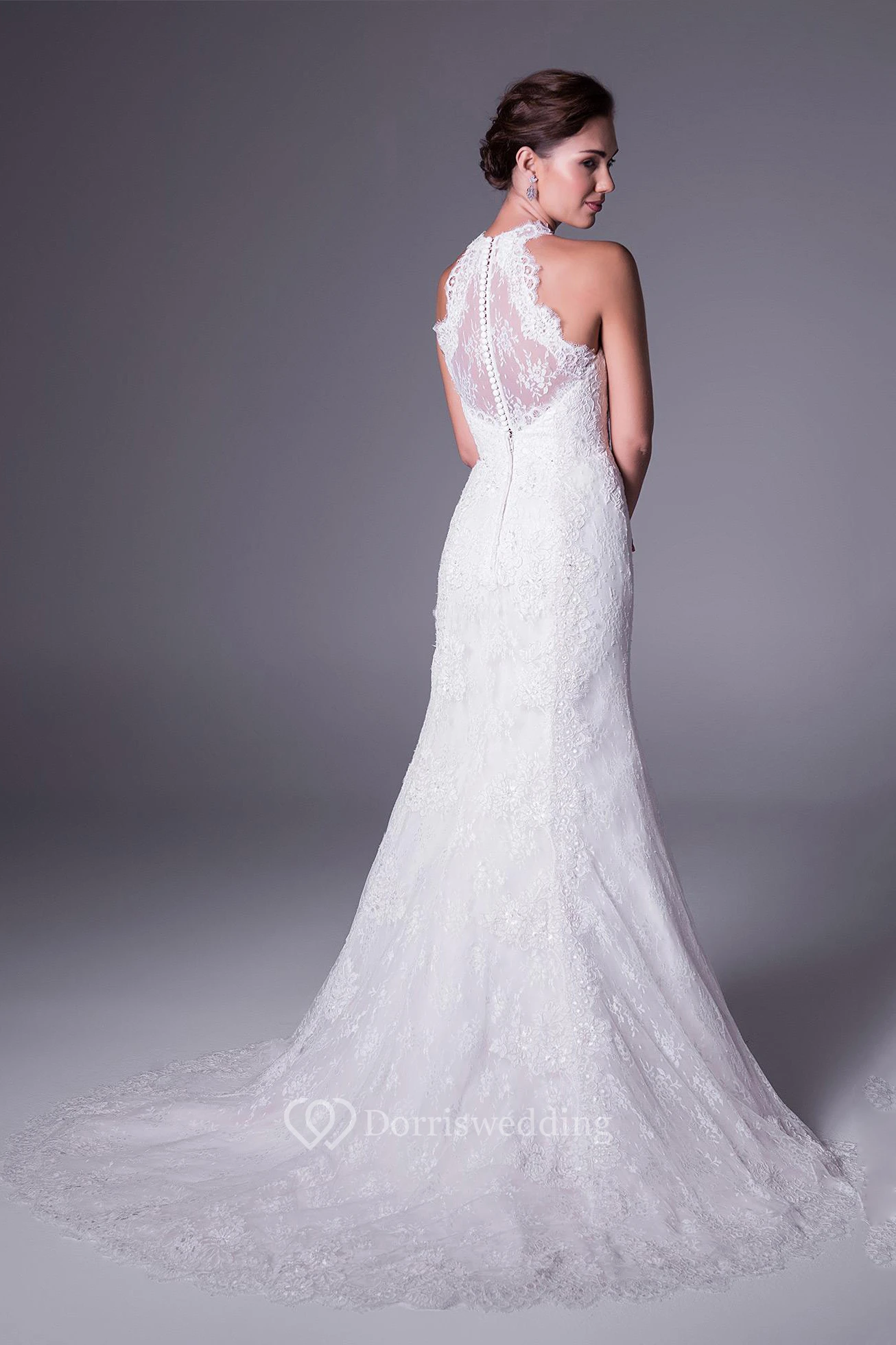 Trumpet Appliqued High-Neck Sleeveless Long Lace Wedding Dress