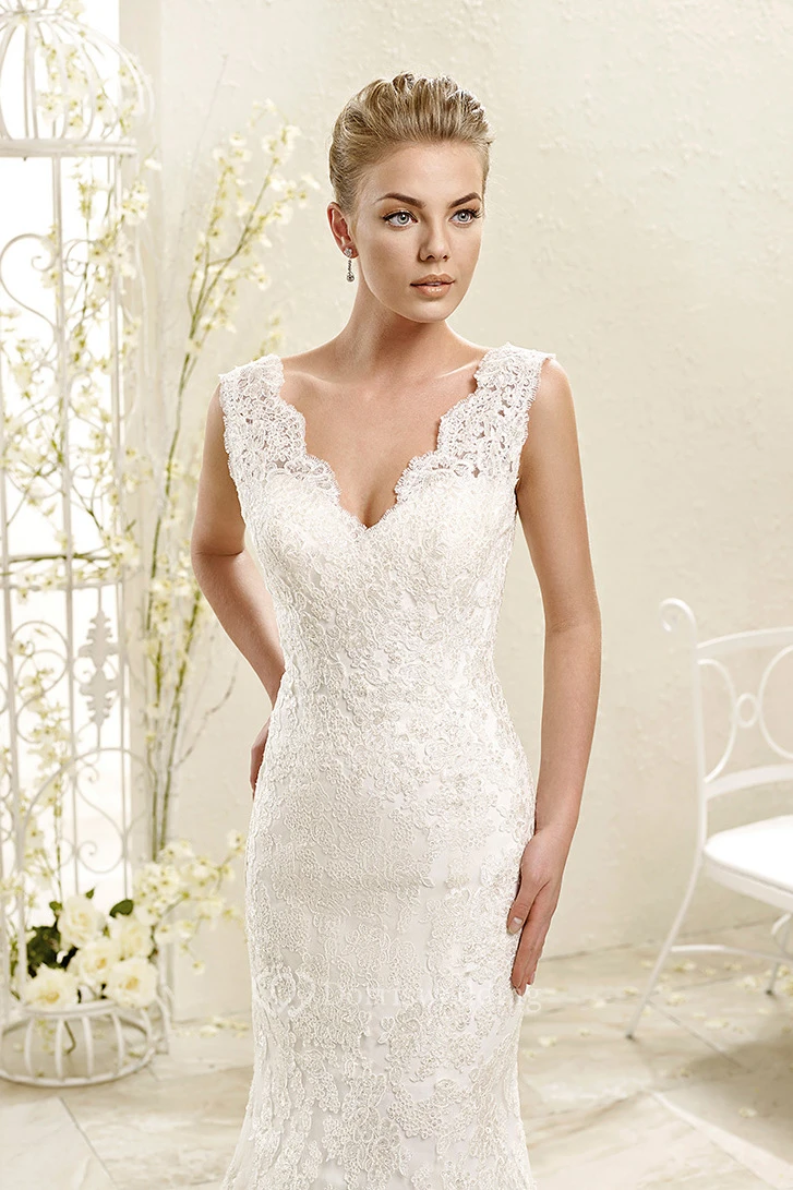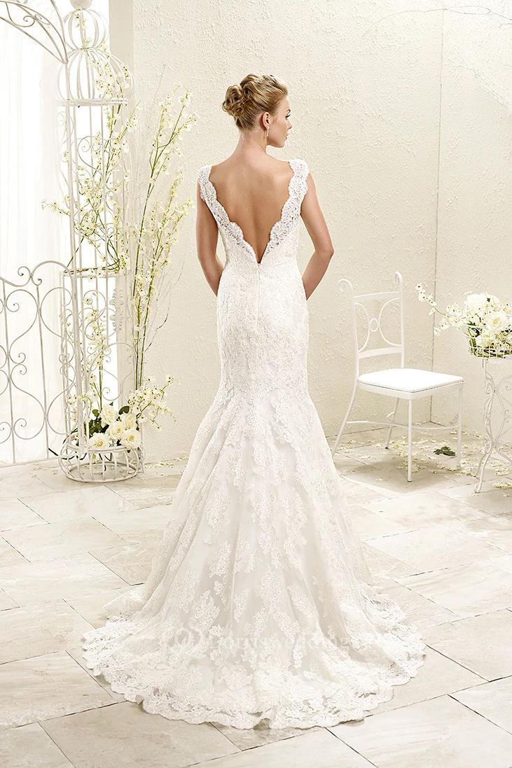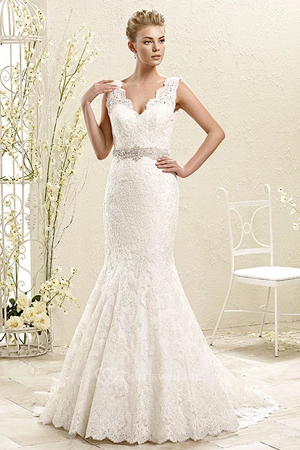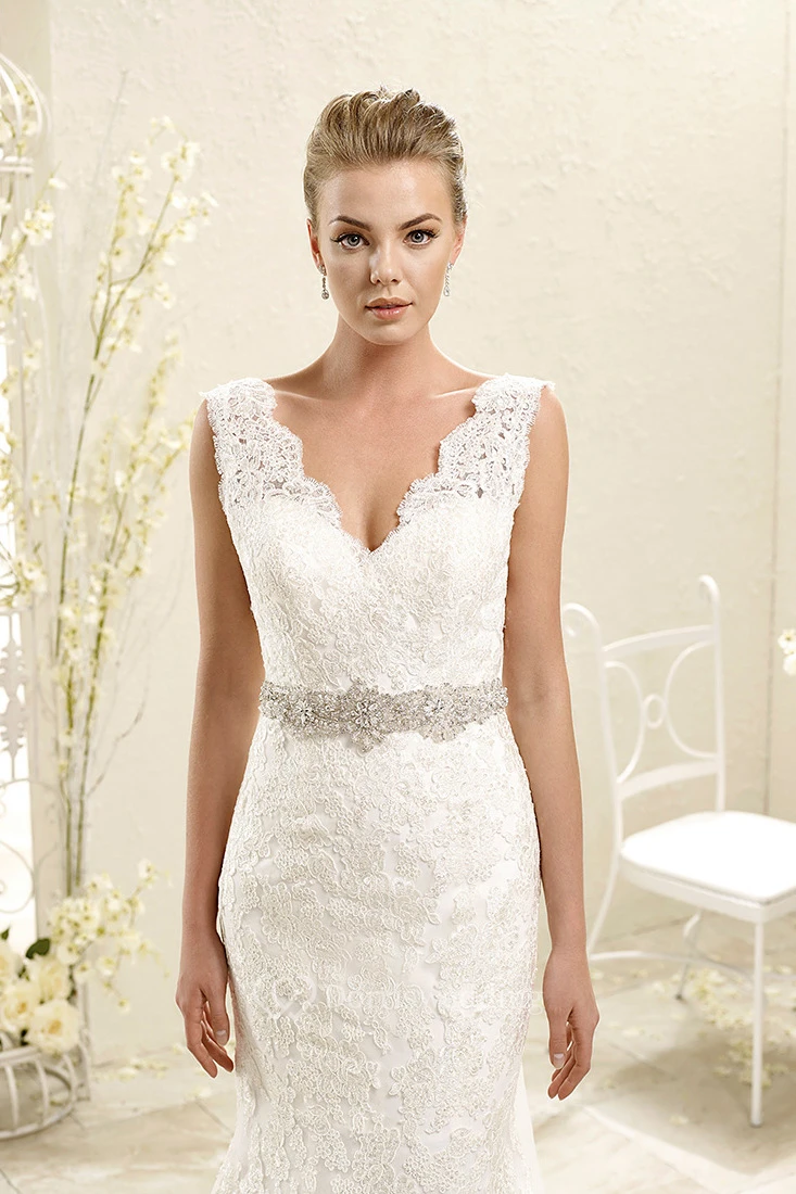 Trumpet Appliqued Long Sleeveless V-Neck Lace Wedding Dress With Waist Jewellery