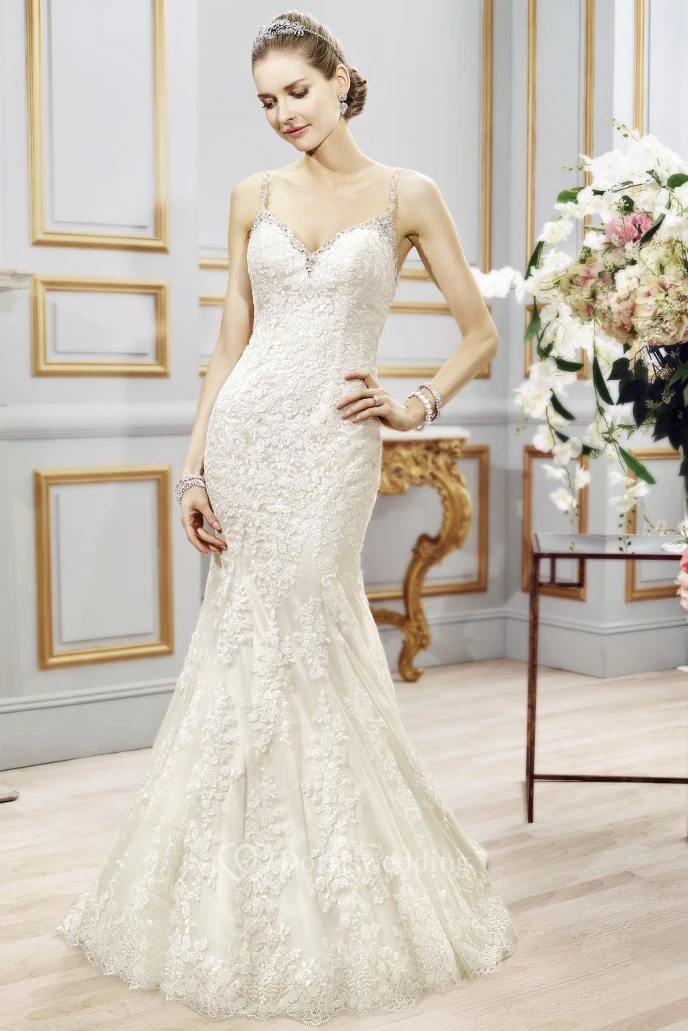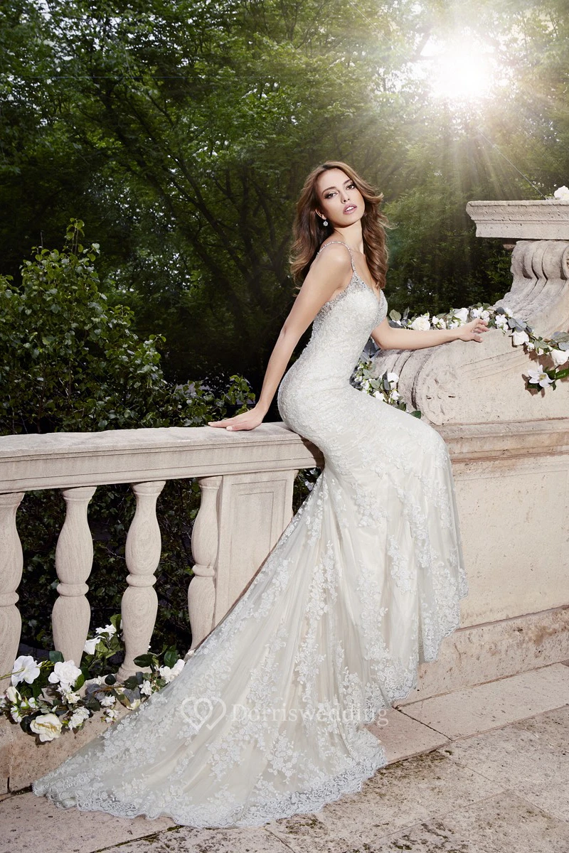 Trumpet Appliqued Spaghetti Long Sleeveless Lace Wedding Dress With Beading And Pleats