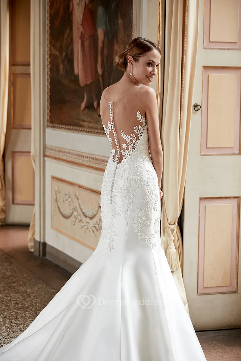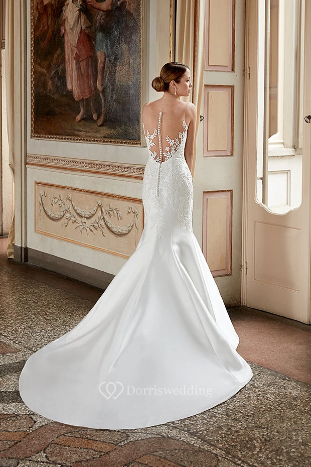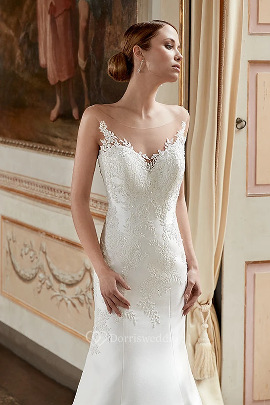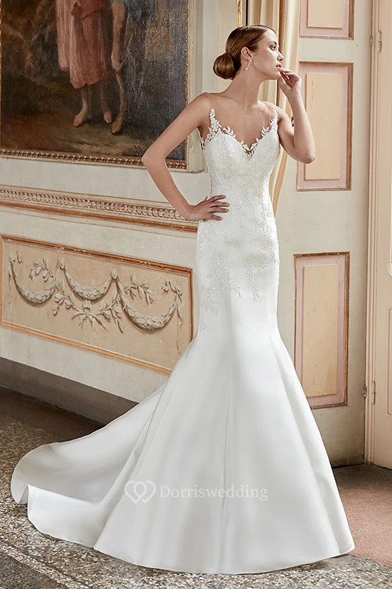 Trumpet Appliqued V-Neck Long Sleeveless Satin Wedding Dress