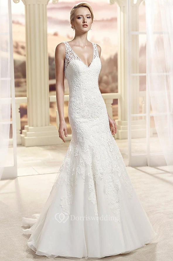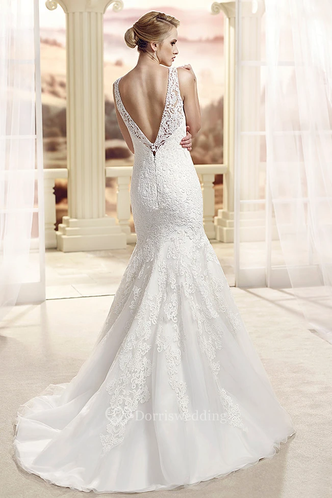 Trumpet Appliqued V-Neck Sleeveless Long Lace Wedding Dress