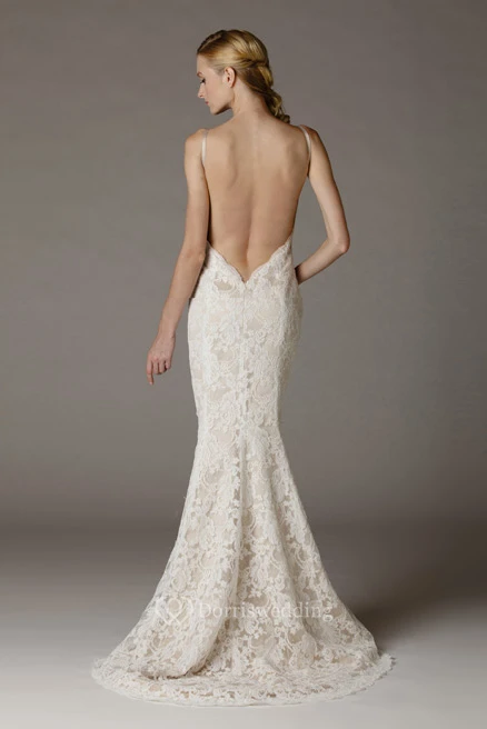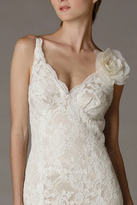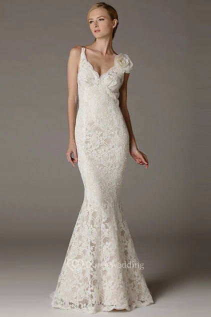 Trumpet Appliqued V-Neck Sleeveless Long Lace Wedding Dress With Flower