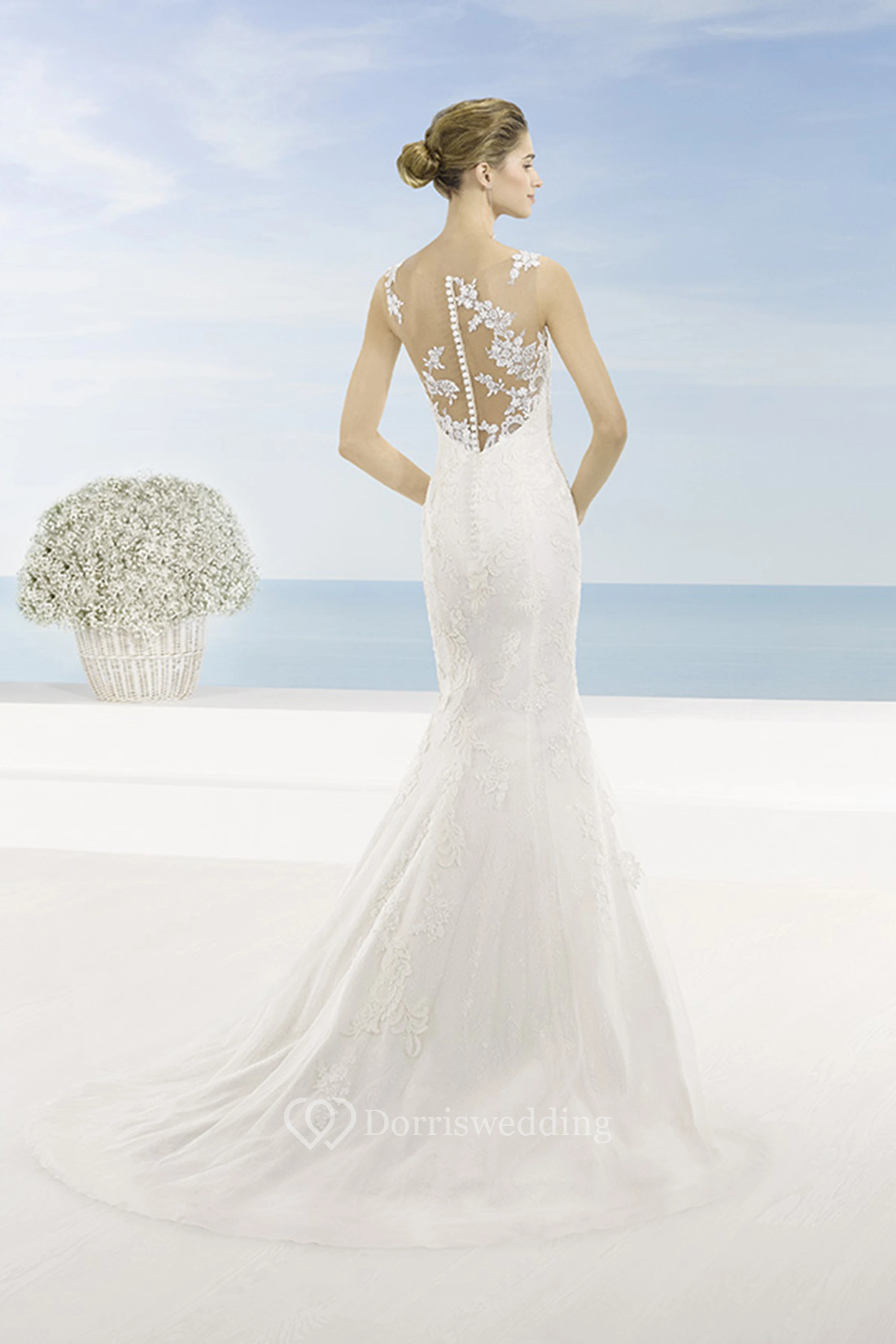 Trumpet Bateau Appliqued Sleeveless Long Lace Wedding Dress With Court Train And Illusion Back