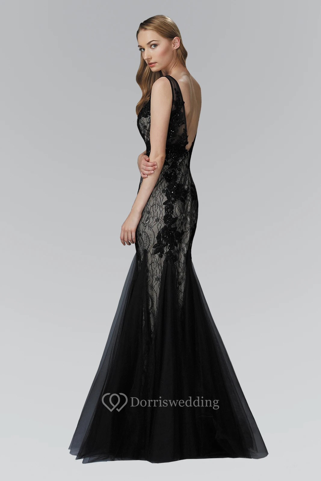 Trumpet Bateau Sleeveless Lace Deep-V Back Dress With Appliques And Beading