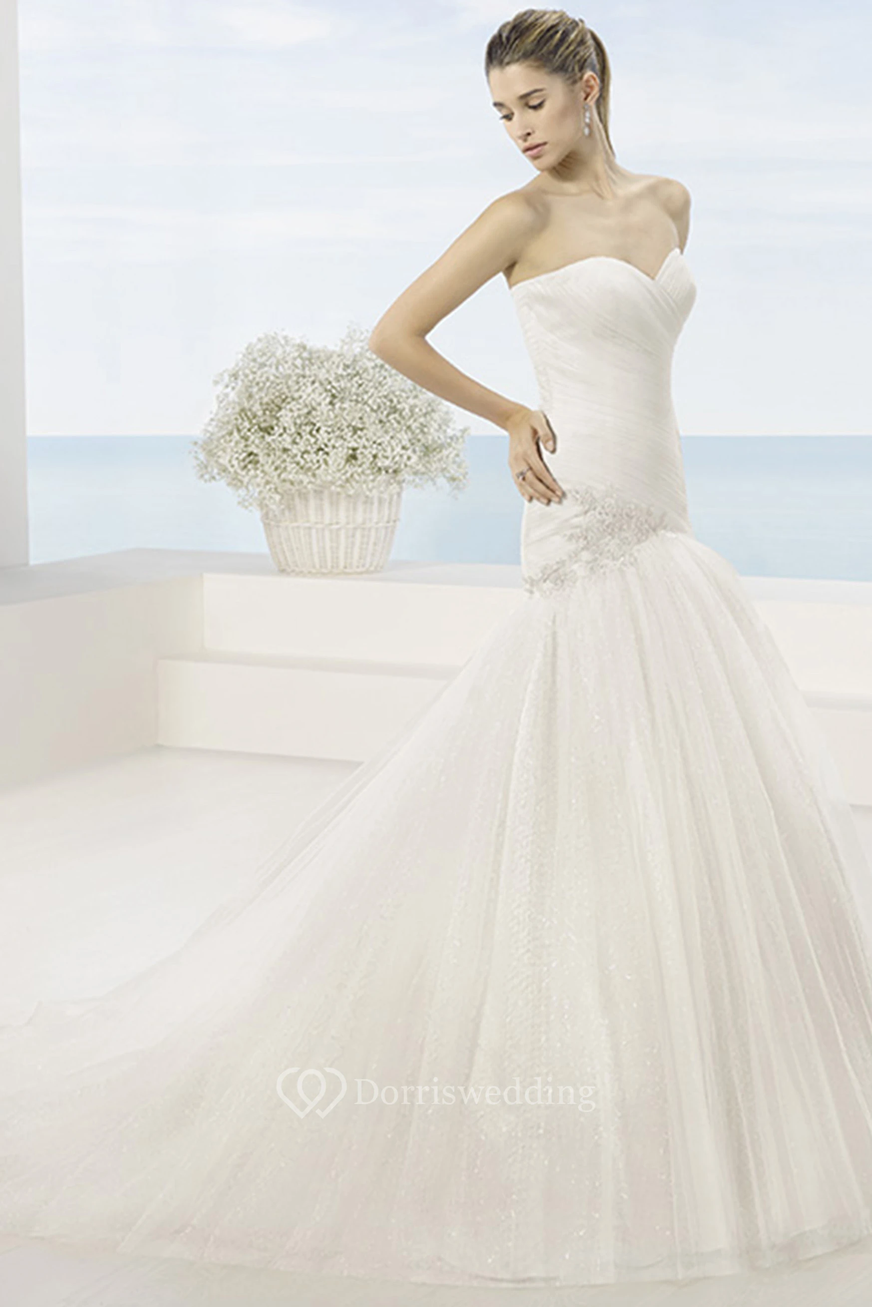 Trumpet Beaded Long Sweetheart Tulle Wedding Dress With Ruching And Bow