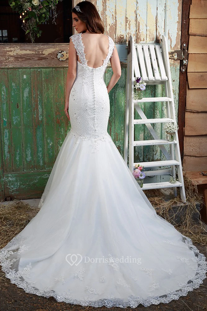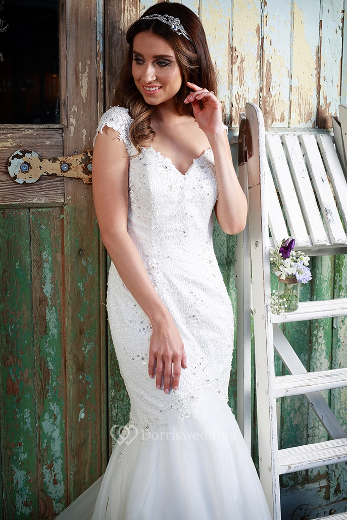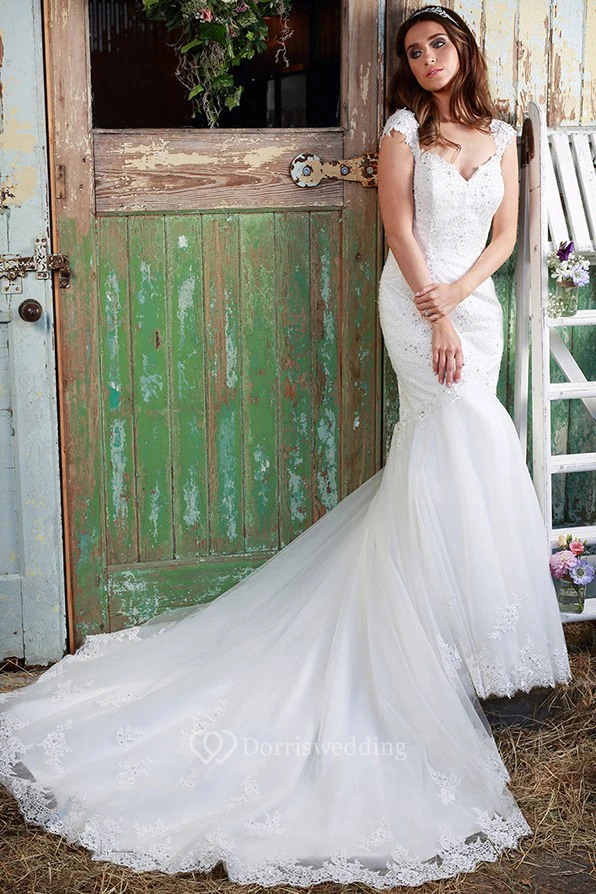 Trumpet Cap-Sleeve Long Appliqued V-Neck Lace Wedding Dress With Beading And Watteau Train