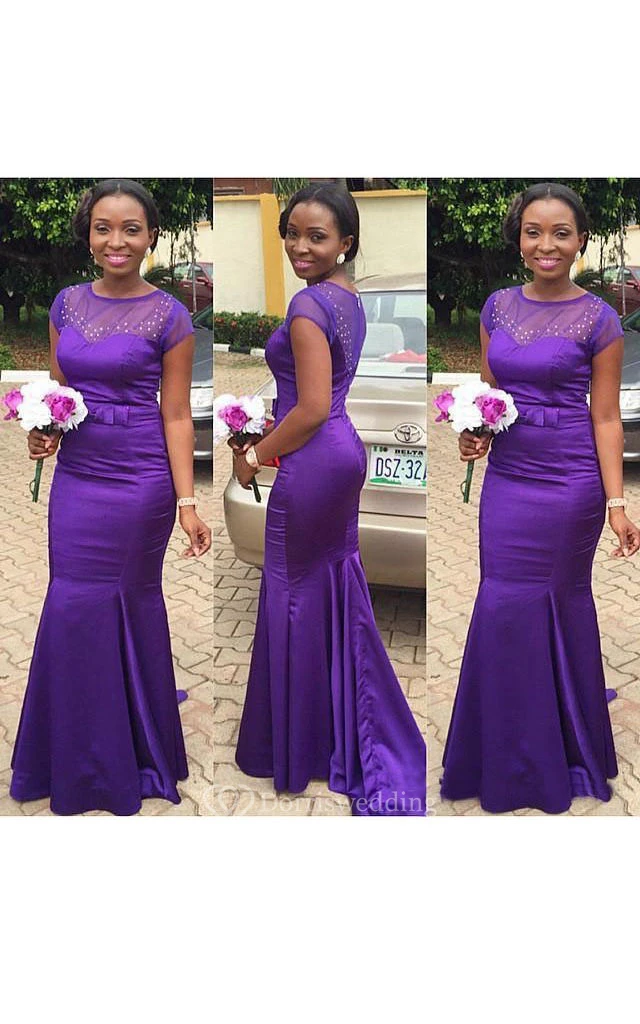 Trumpet Cap-sleeved Bow Beading Sweep Train Satin Dress