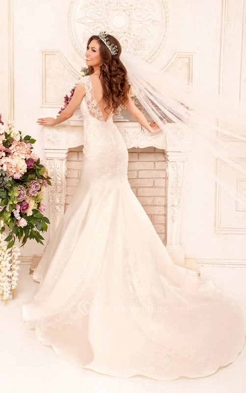 Trumpet Floor-Length Bateau Cap-Sleeve Deep-V-Back Satin Dress With Appliques