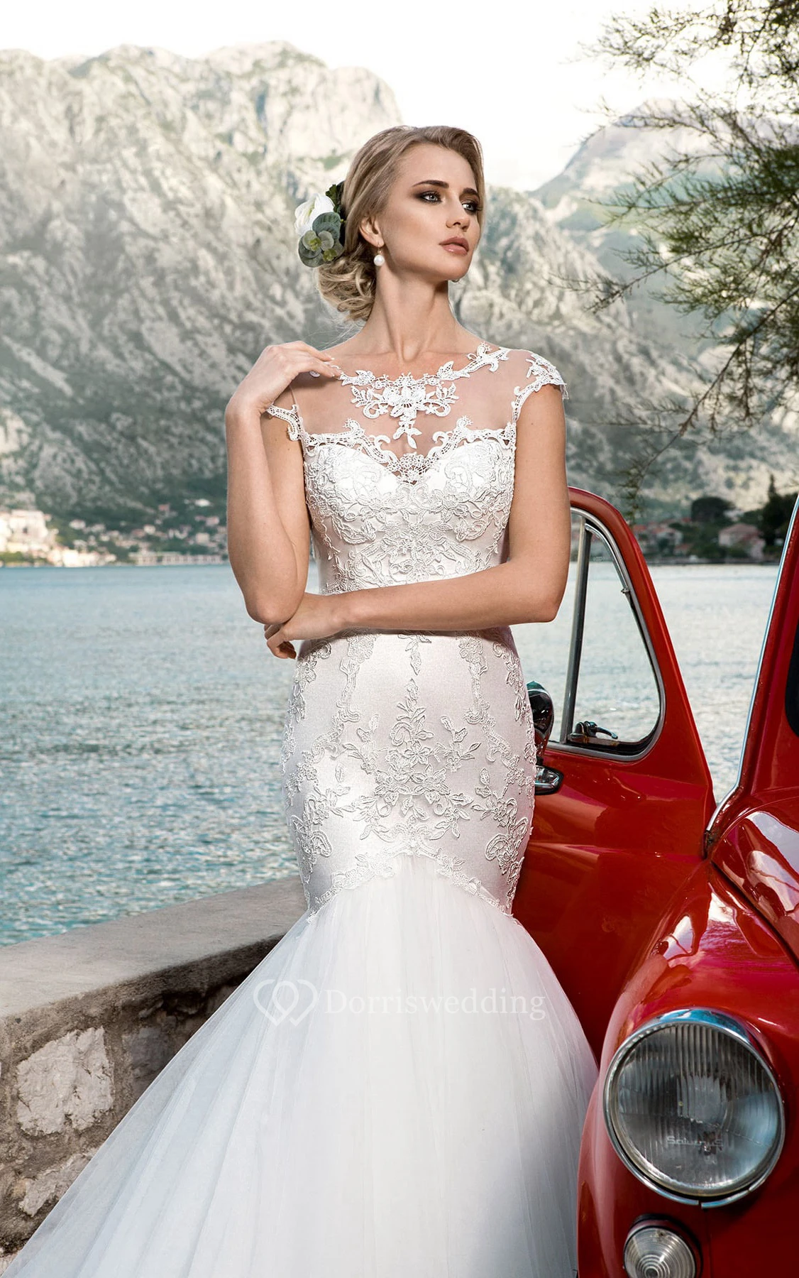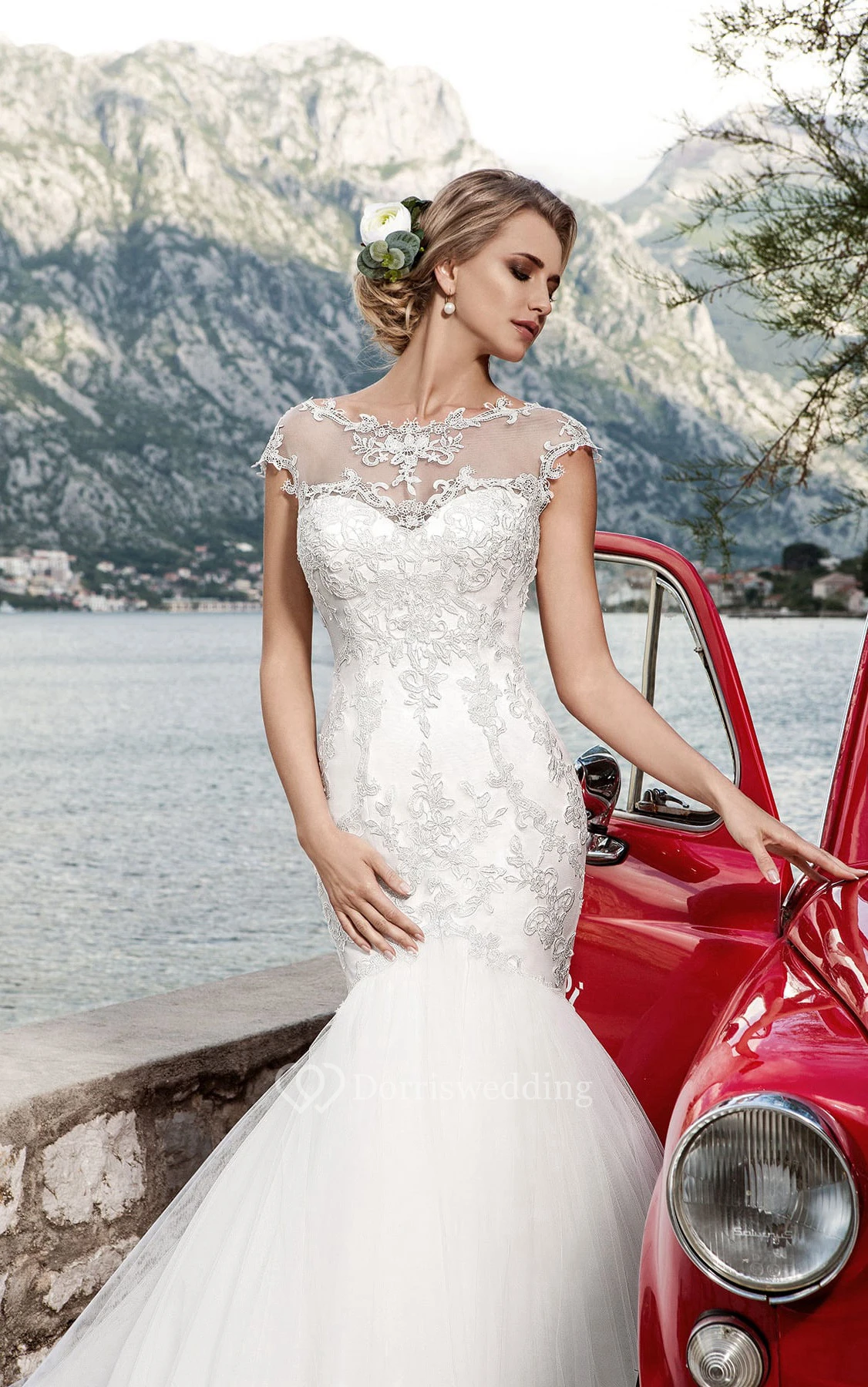 Trumpet Floor-Length Jewel-Neck Cap-Sleeve Corset-Back Tulle Dress With Appliques