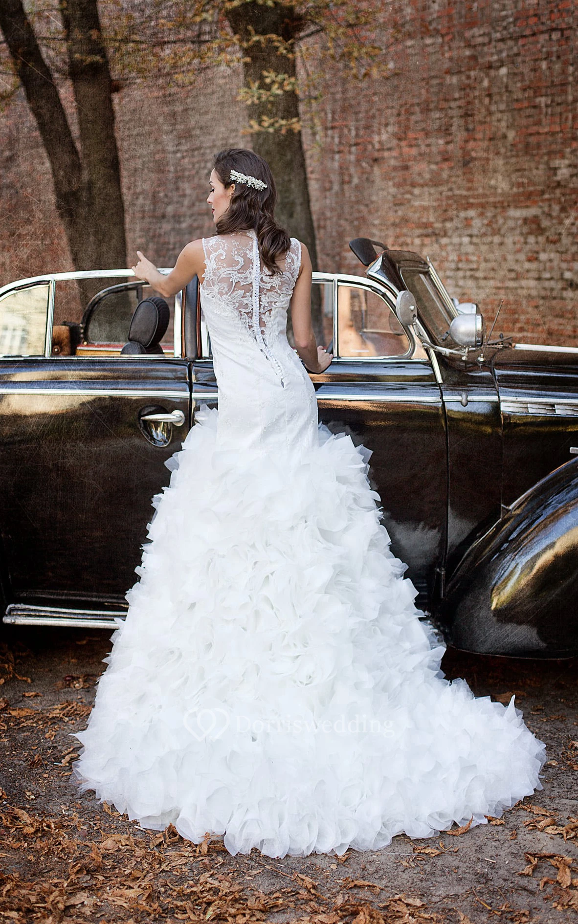 Trumpet Floor-Length Scoop Sleeveless Illusion Tulle Dress With Ruffles And Appliques