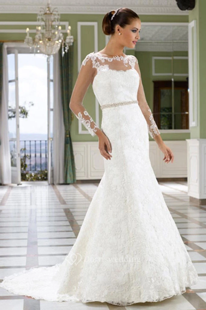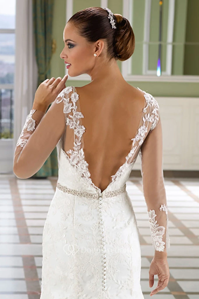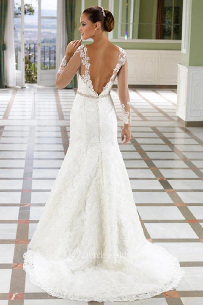 Trumpet Floor-Length Sleeveless Lace Wedding Dress With Court Train And Deep-V Back