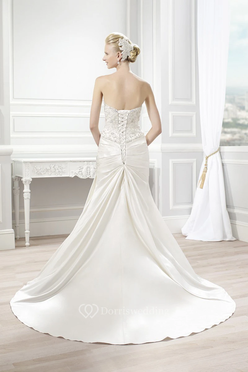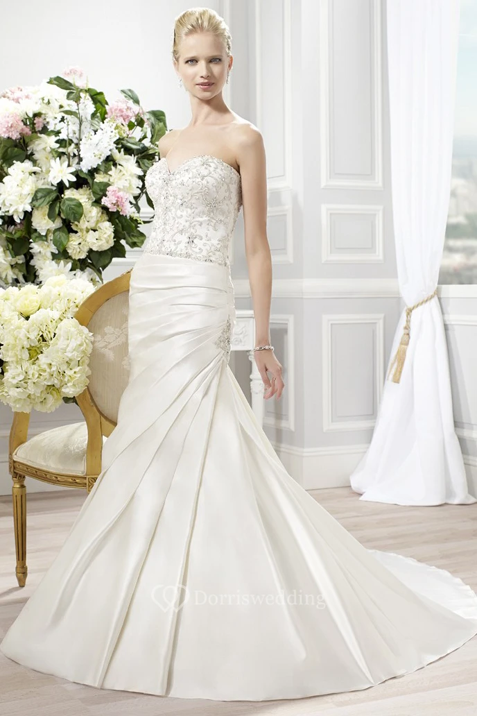 Trumpet Floor-Length Sweetheart Sleeveless Beaded Satin Wedding Dress With Side Draping And Corset Back