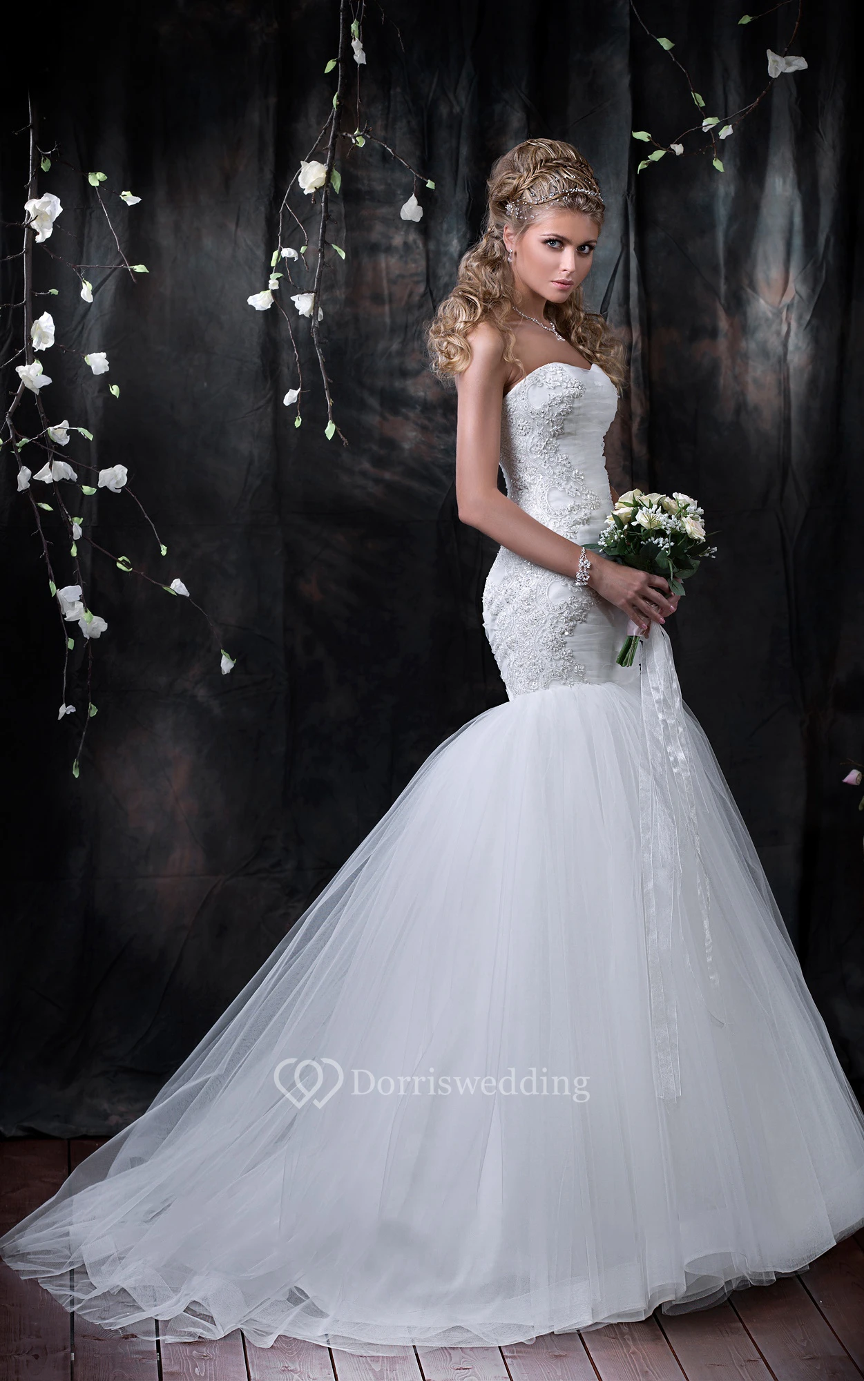 • Hemline/Train: Floor-length, Sweep/Brush Train