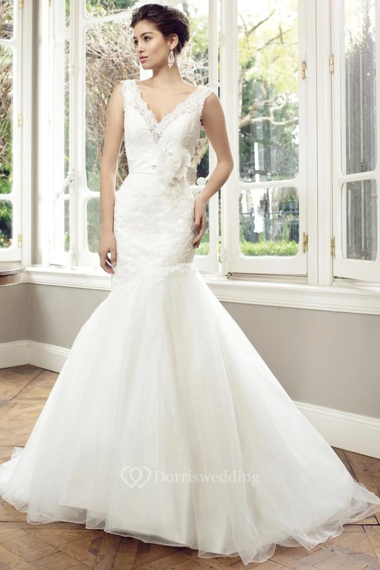Trumpet Floral V-Neck Sleeveless Long Lace&Tulle&Satin Wedding Dress With Appliques And Low-V Back