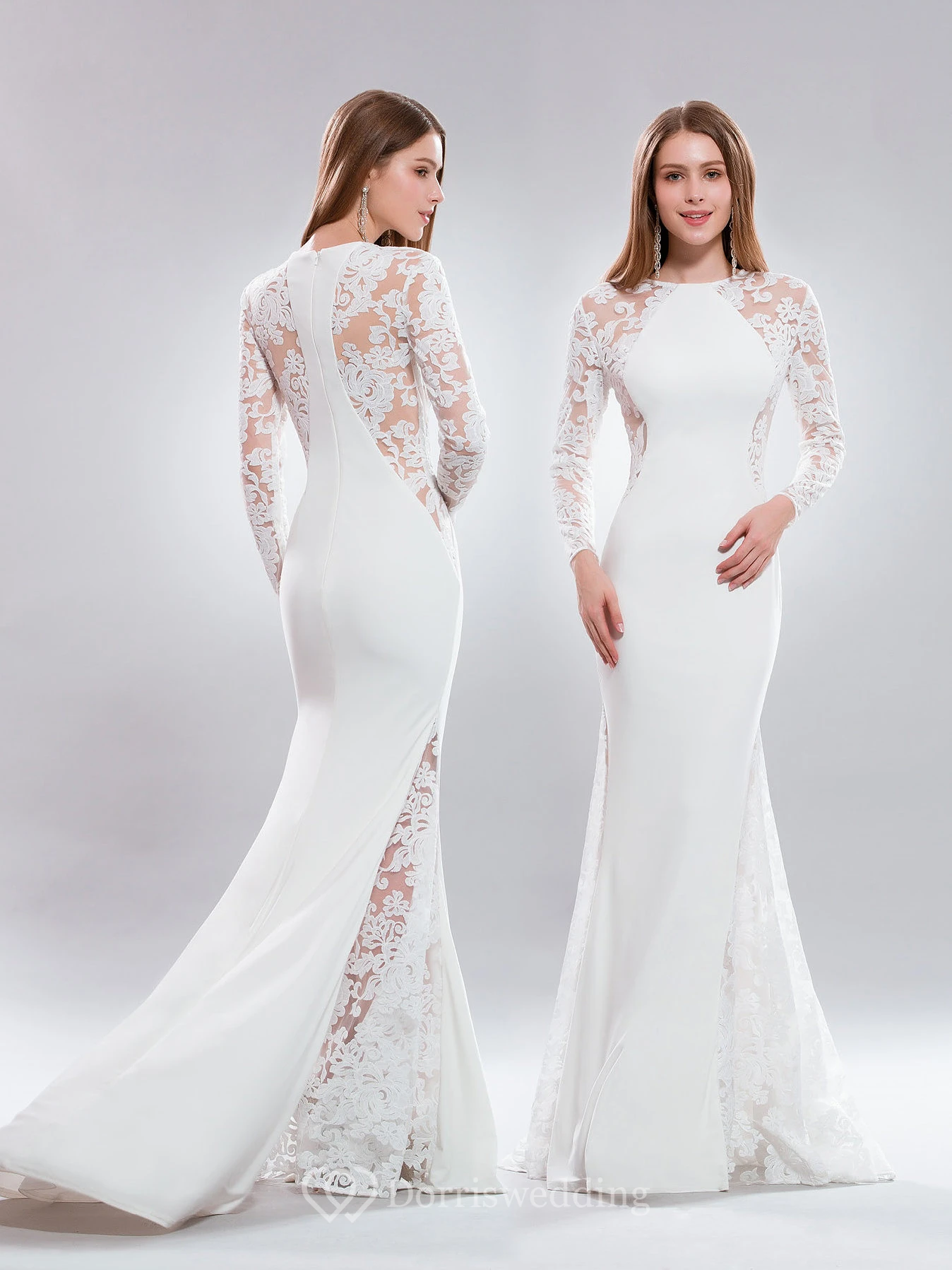 Trumpet Jewel-Neck Illusion Long Sleeve Jersey Dress With Appliques