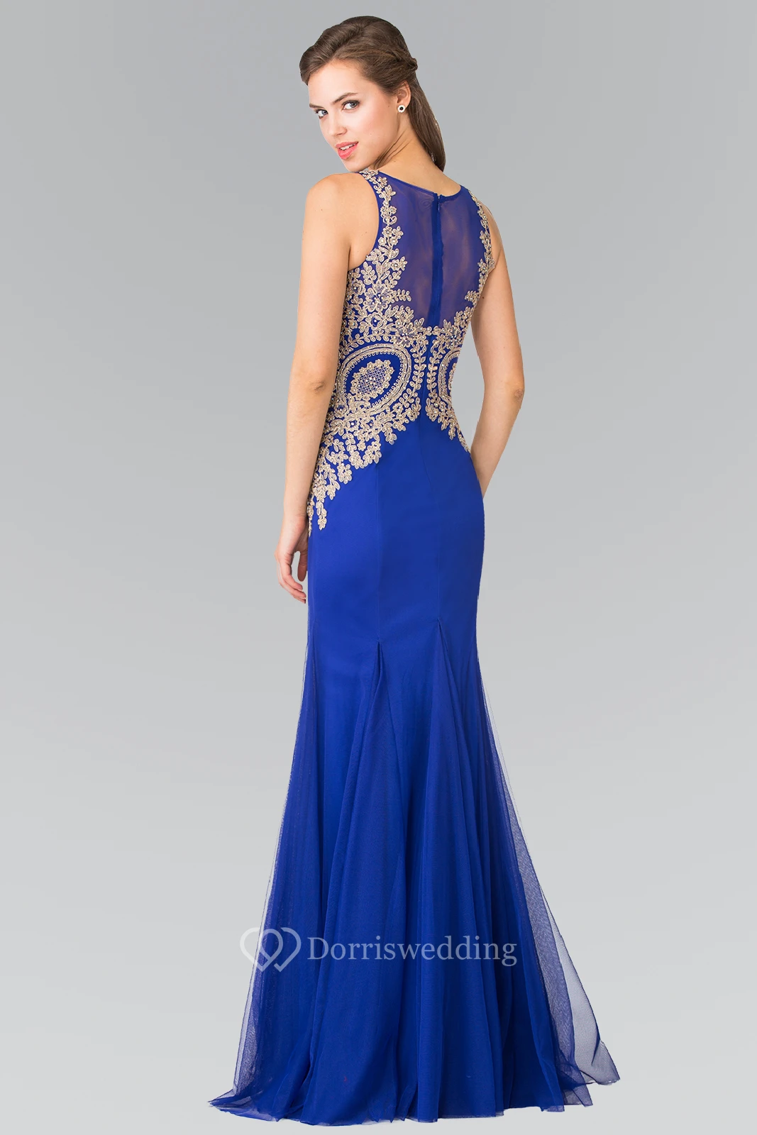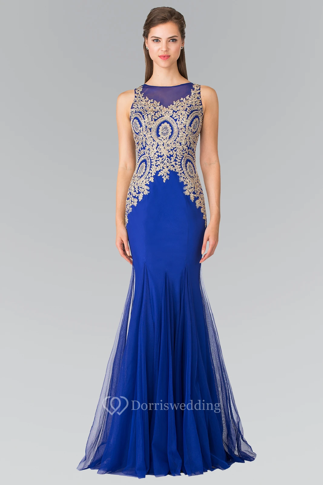 Trumpet Jewel-Neck Jersey Tulle Illusion Dress With Appliques And Beading