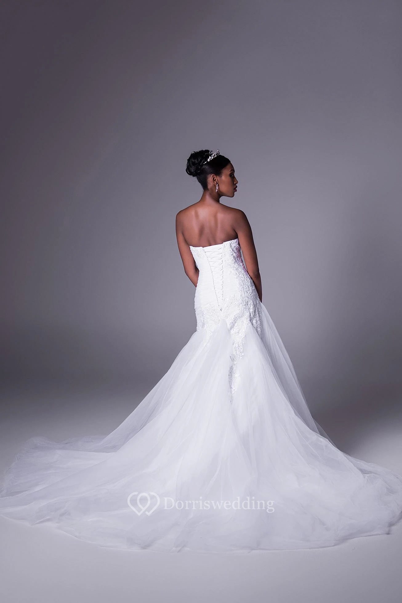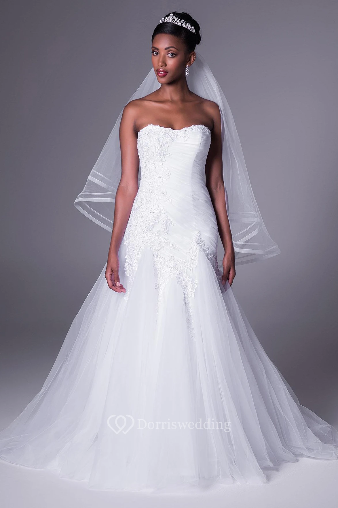 Trumpet Long Appliqued Strapless Tulle Wedding Dress With Ruching And Corset Back