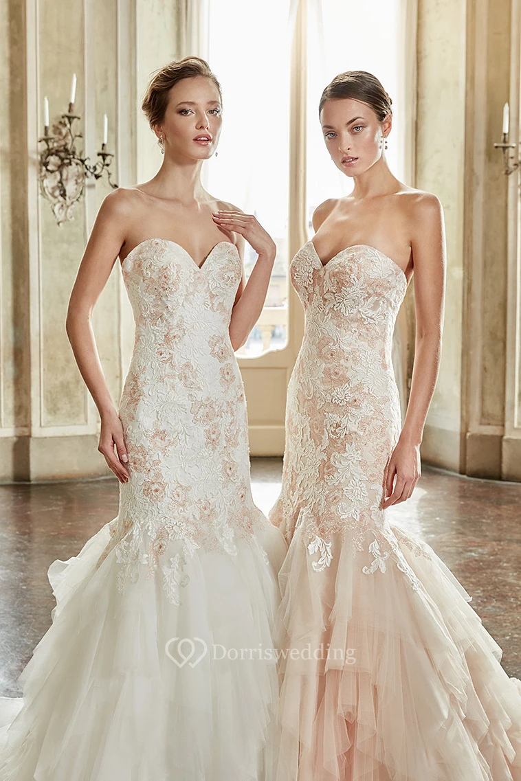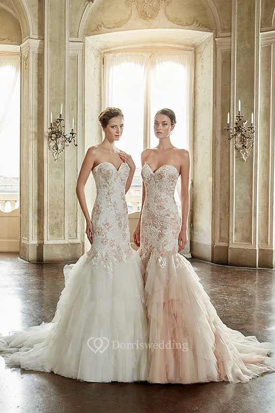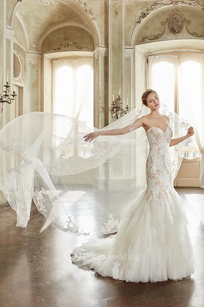 Trumpet Long Appliqued Sweetheart Tulle&Lace Wedding Dress With Cascading Ruffles And Court Train