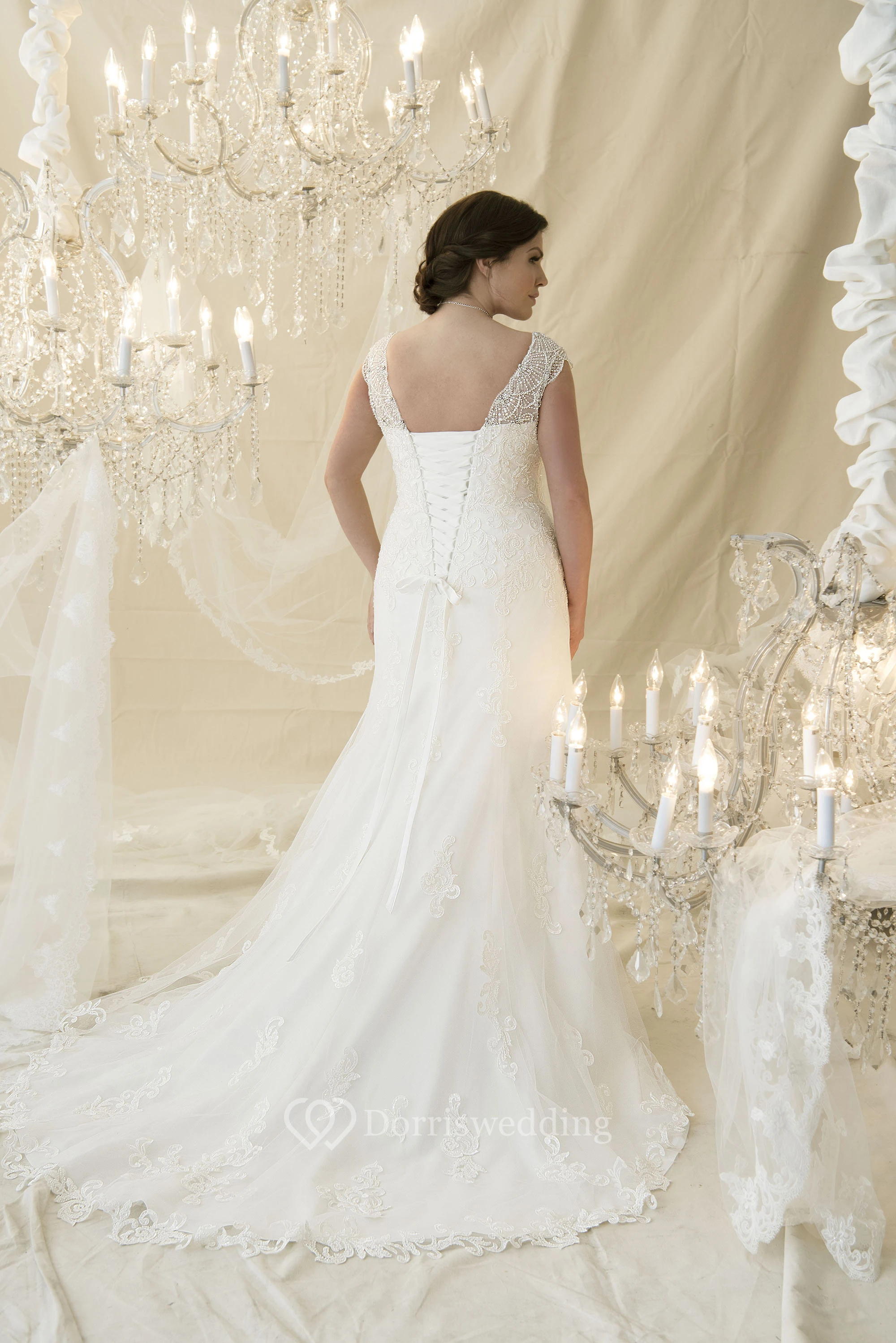 Trumpet Long Cap-Sleeve Beaded V-Neck Lace Plus Size Wedding Dress With Appliques And Corset Back