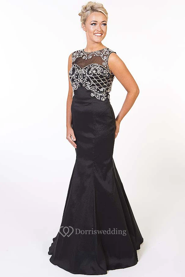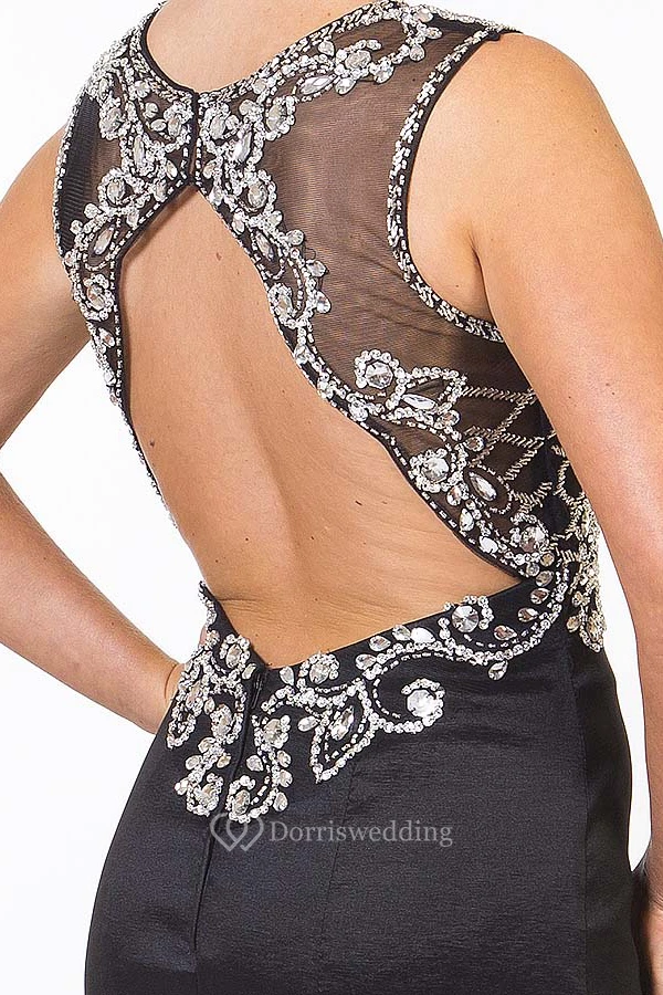 Trumpet Long Sleeveless Scoop Beaded Satin Prom Dress With Keyhole Back