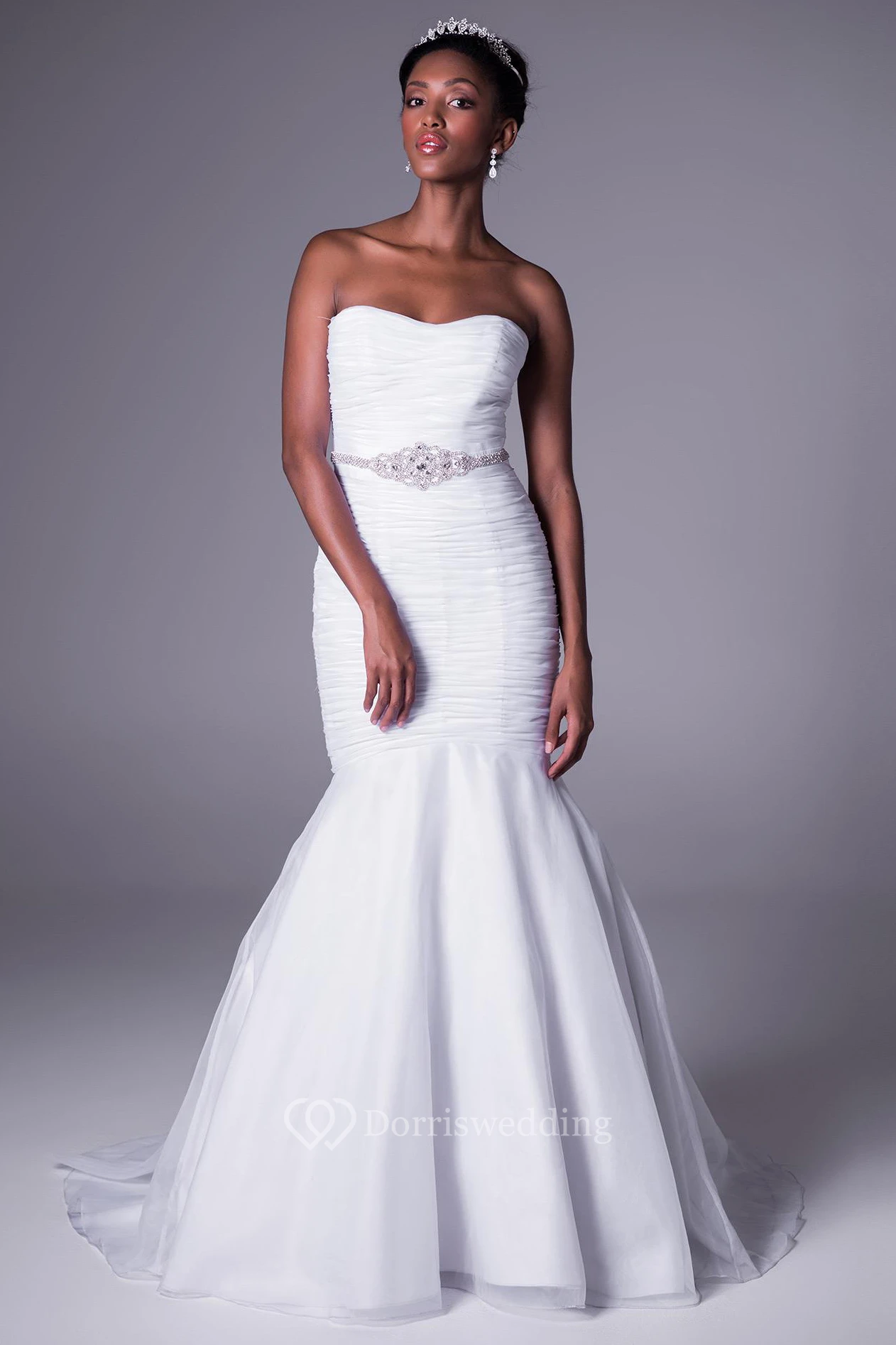 Trumpet Long Strapless Jeweled Chiffon Wedding Dress With Ruching And Brush Train