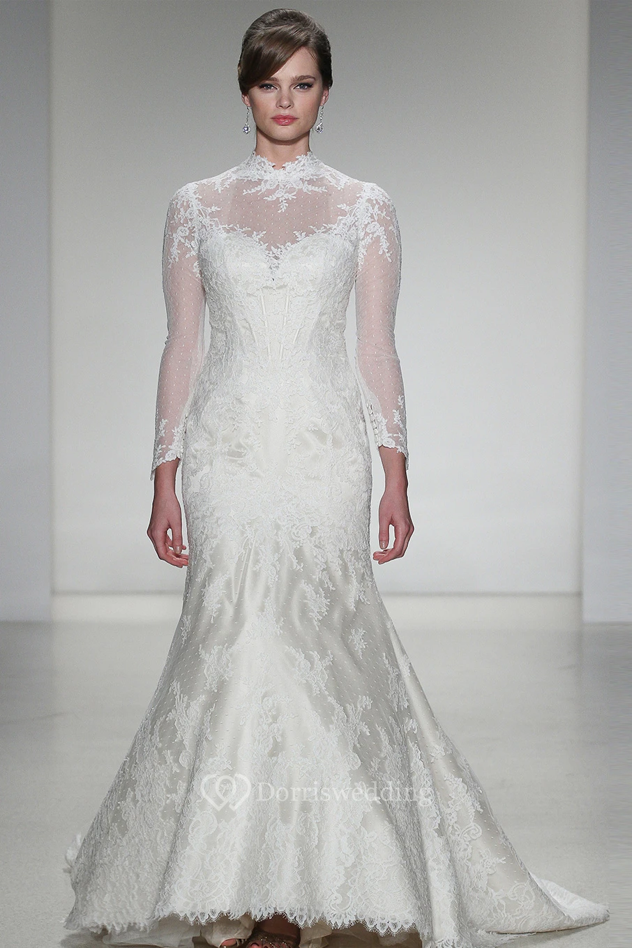 Trumpet Maxi Long-Sleeve High Neck Lace Wedding Dress With Appliques And Illusion