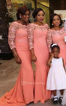 Trumpet Maxi Scoop Bell 3-4 Sleeve Appliques Chiffon Lace Dress