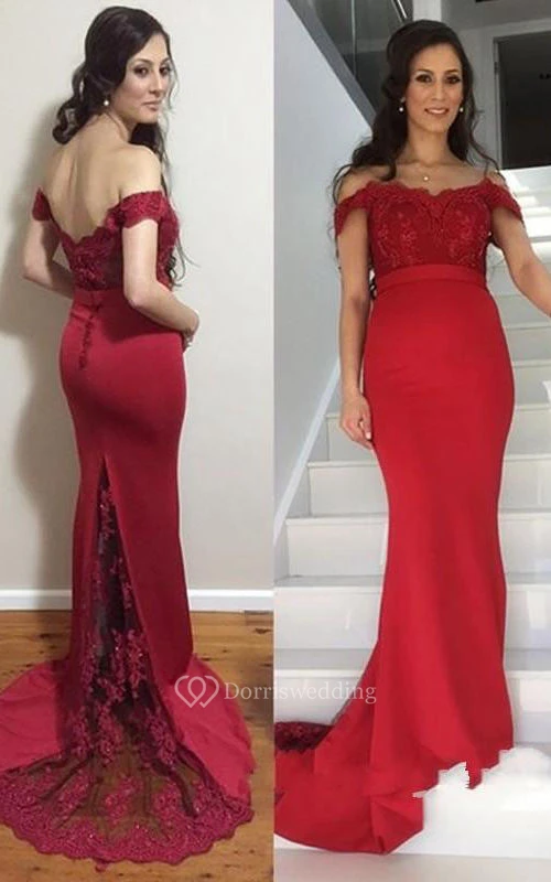 Trumpet Off-the-shoulder Lace Satin Dress with V-back