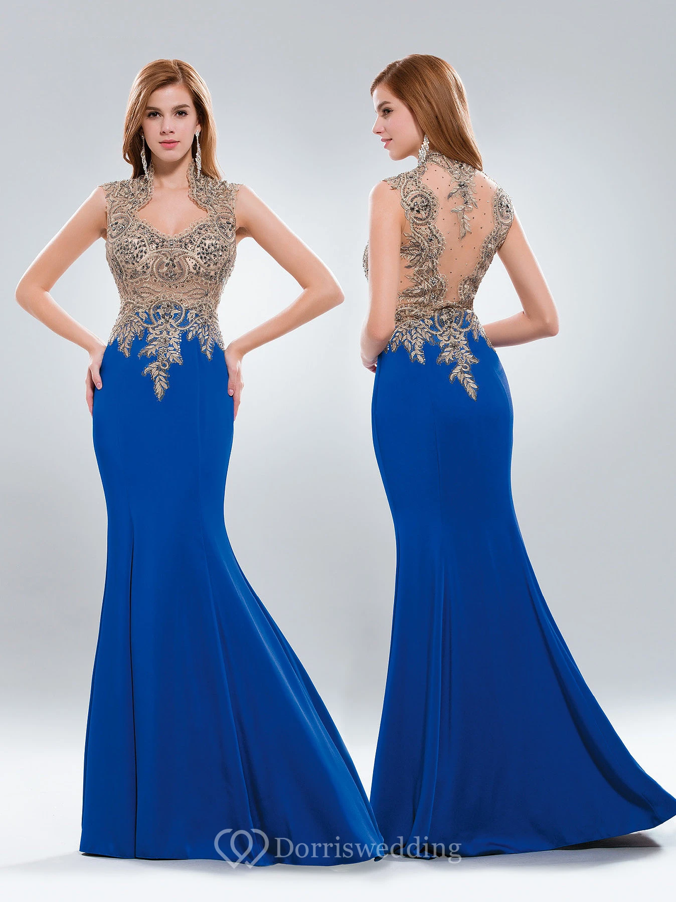 Trumpet Queen Anne Sleeveless Jersey Illusion Dress With Appliques