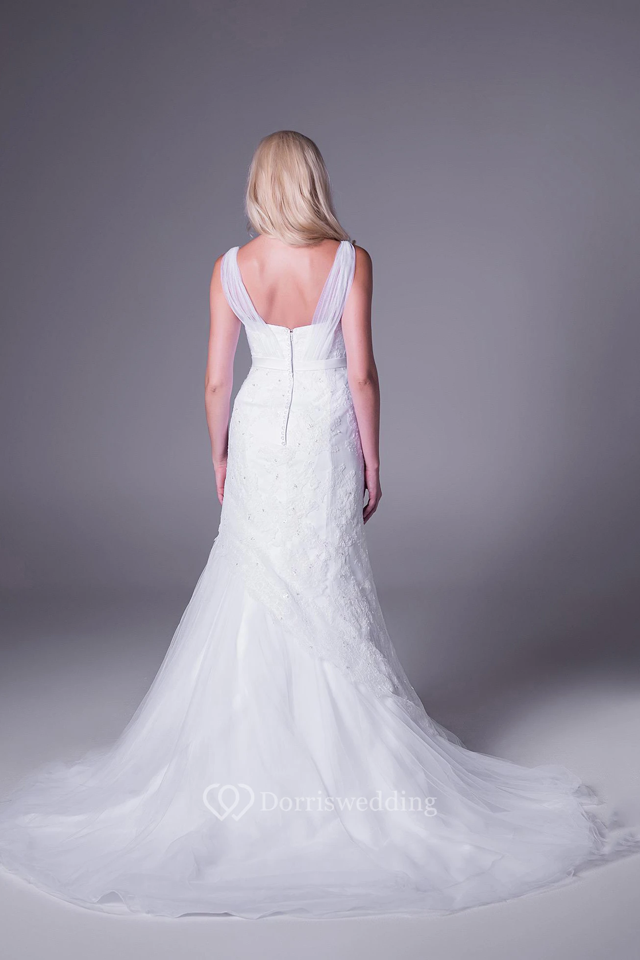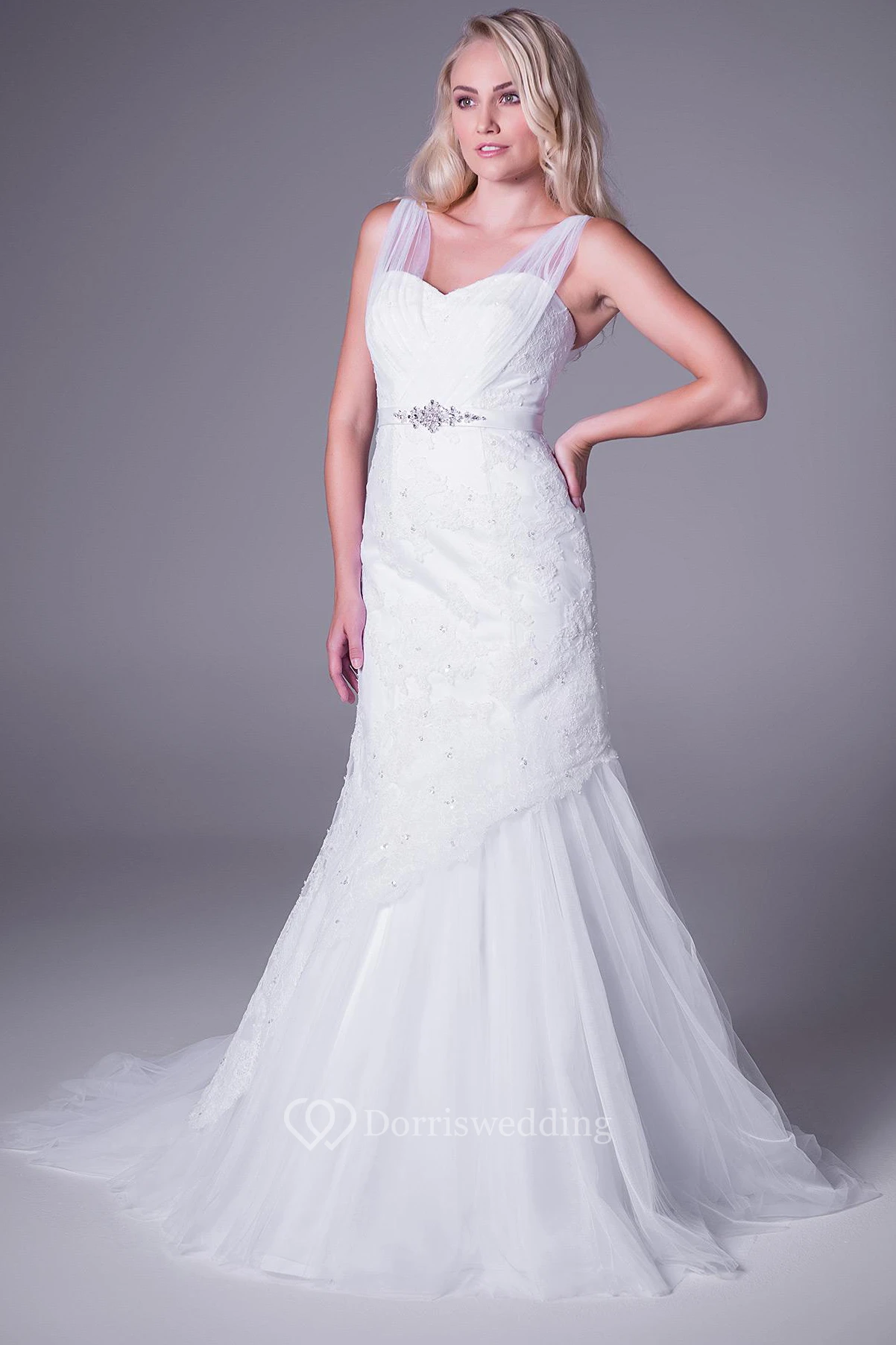 Trumpet Sleeveless Appliqued Floor-Length Strapped Tulle Wedding Dress With Waist Jewellery And Ruffles