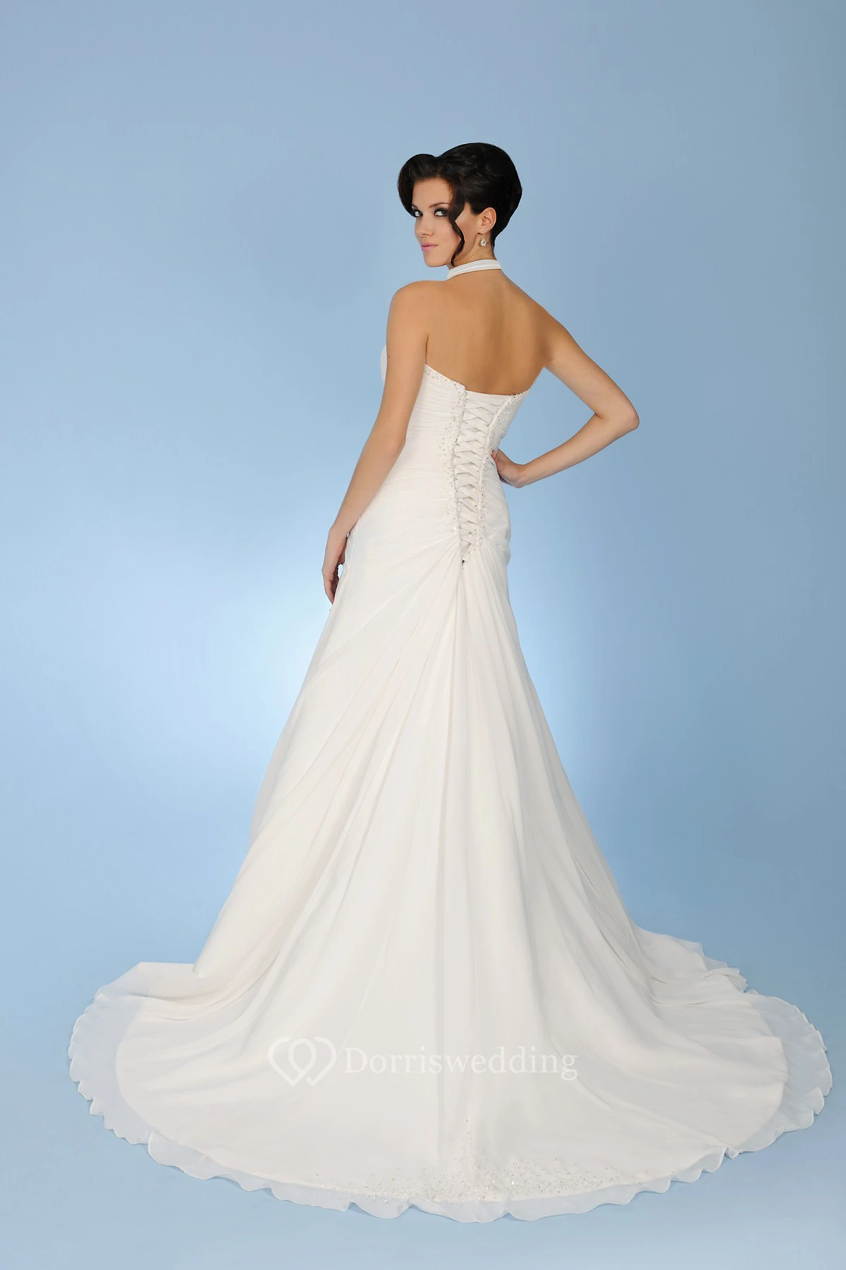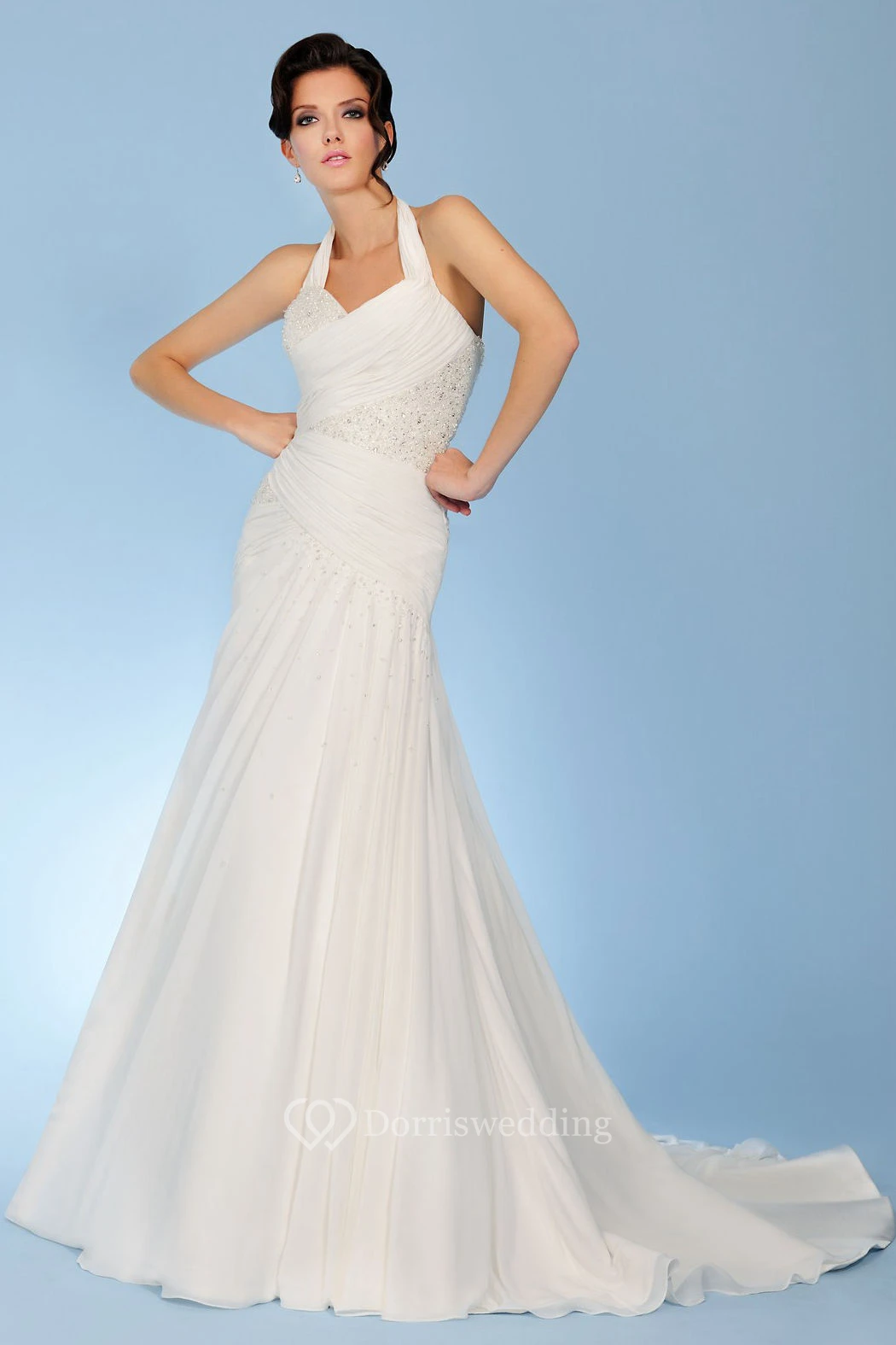 Trumpet Sleeveless Halter Beaded Long Chiffon Wedding Dress With Corset Back And Ruching