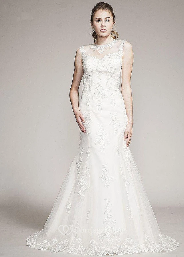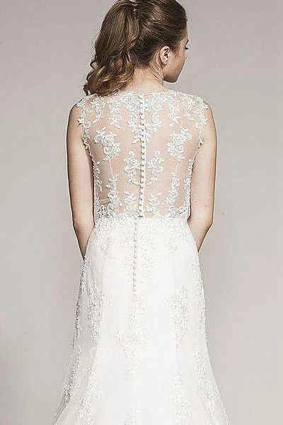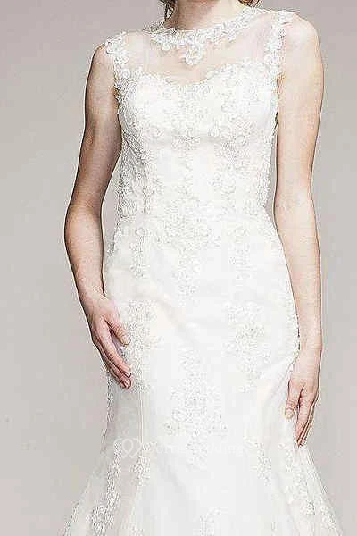 Trumpet Sleeveless Jewel-Neck Long Appliqued Lace Wedding Dress